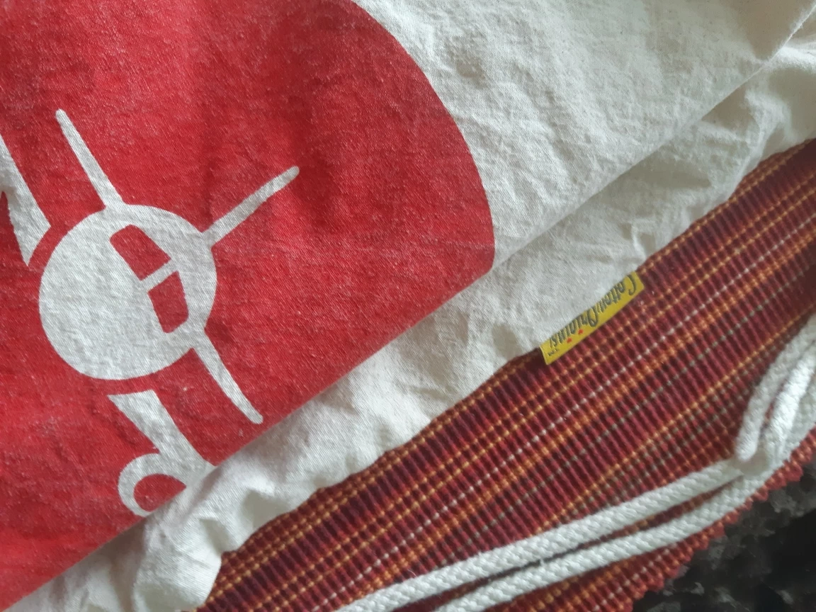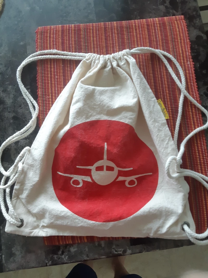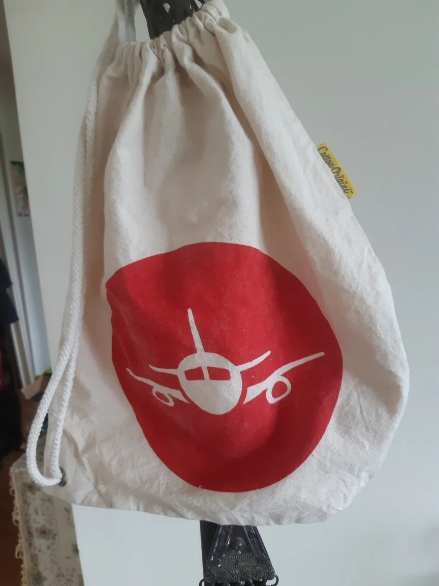 This is a Cotton drawstring light backpack. It features a red airplane logo on the front and has a small zippered pocket on the back.