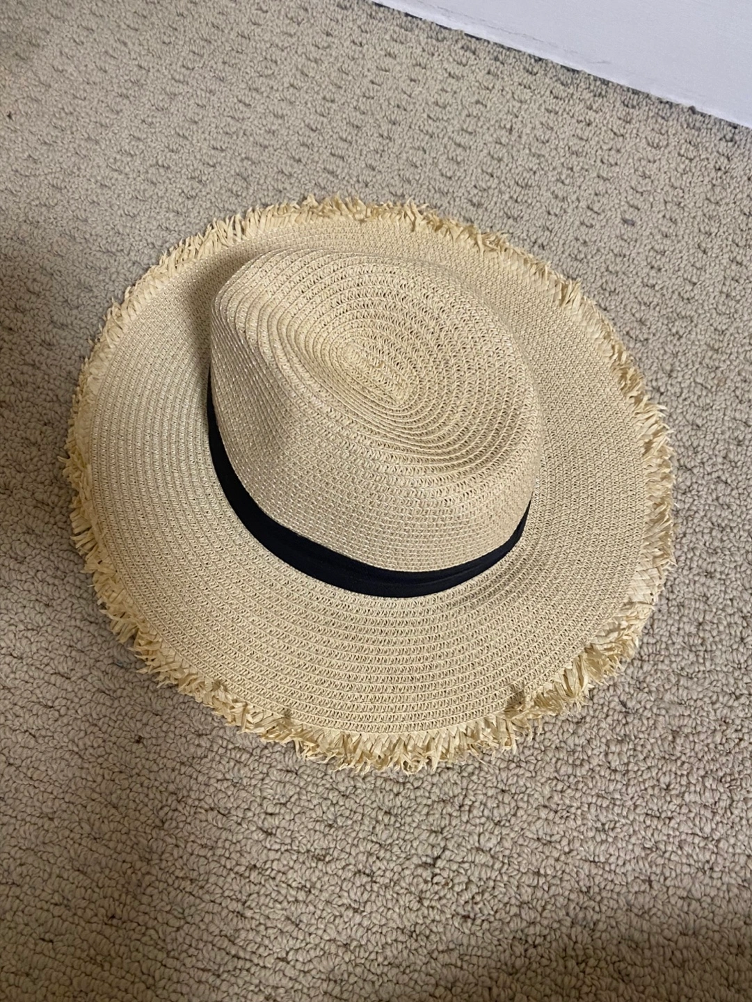 A stylish straw fedora hat, perfect for sunny days! It features a classic design with a black band around the base of the crown and a fringed brim. Great for adding a touch of elegance to any outfit!