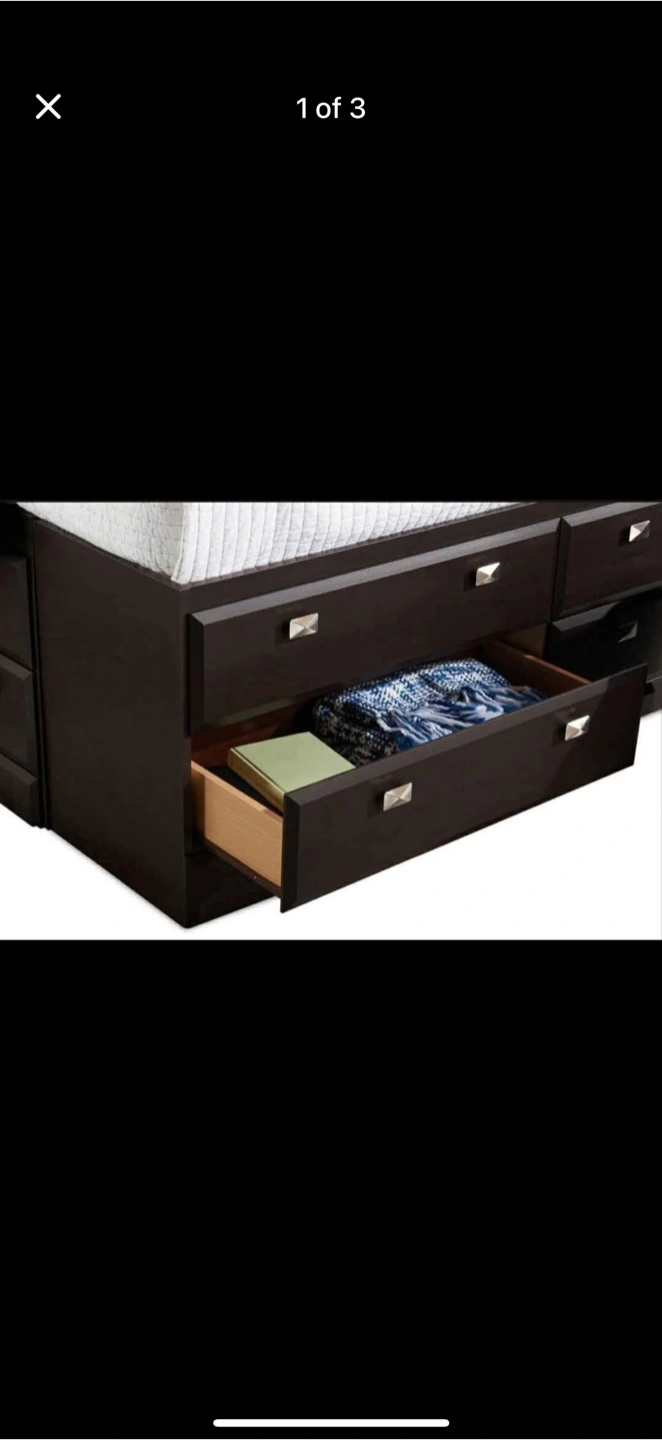 Espresso brown bed frame with built-in storage drawers! Perfect for optimizing space in your bedroom. The drawers offer a convenient solution for storing extra bedding, clothing, or other items. It's in great condition and ready for a new home!