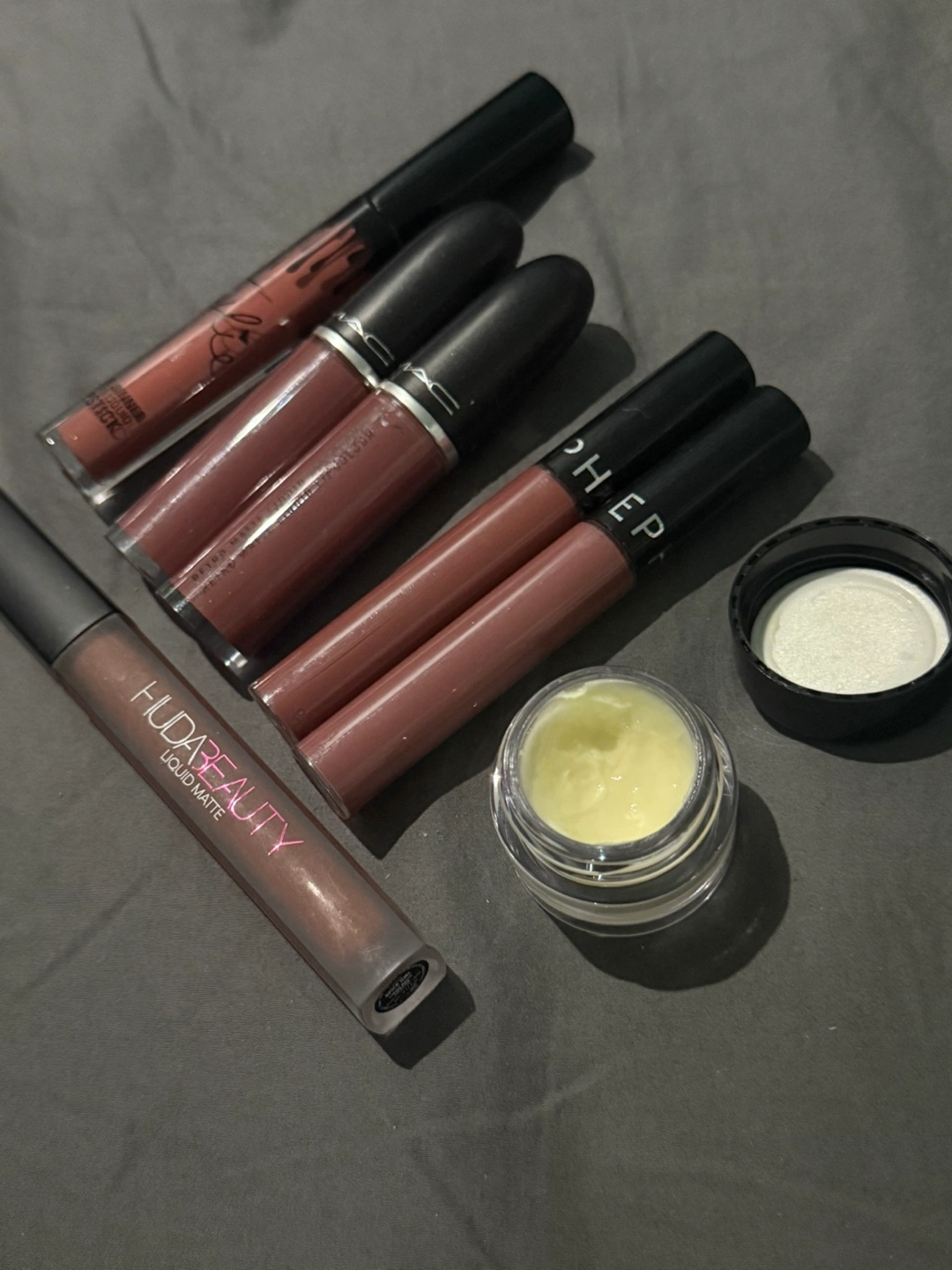 Selling a mixed lot of lipsticks from brands like Huda Beauty, MAC (Retro Matte Liquid Lipcolour), Sephora, and Kylie Cosmetics. Also included is a Bobbi Brown Vitamin Enriched Face Base.
