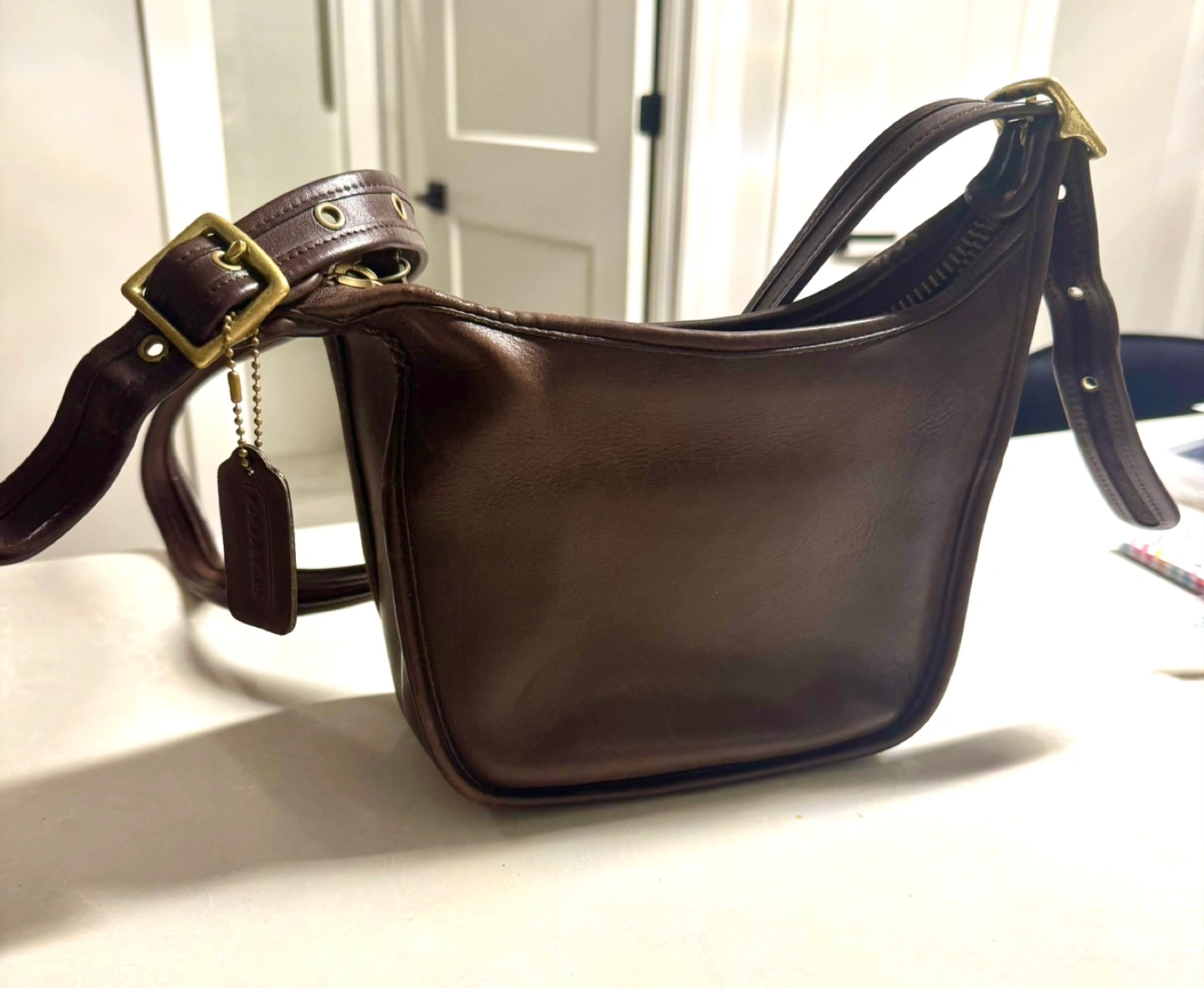 This is an authentic Vintage Coach bag called “Janice Riccardi Disanto’s Legacy Bag”. It's made of leather and has a zipper closure.
