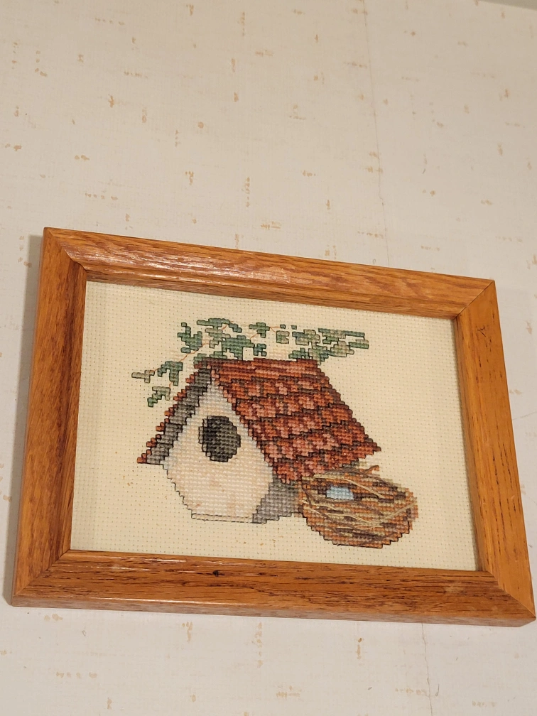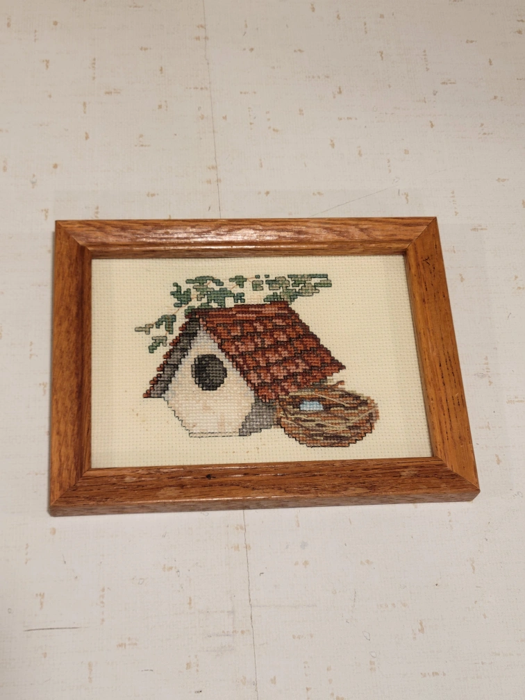 Add a touch of handmade charm to your home with this framed cross-stitch artwork! This piece features a quaint birdhouse design, complete with a nest, meticulously stitched with care. It's a unique and cozy addition to any room, bringing a bit of rustic warmth. The artwork is in used condition, showing its vintage appeal.