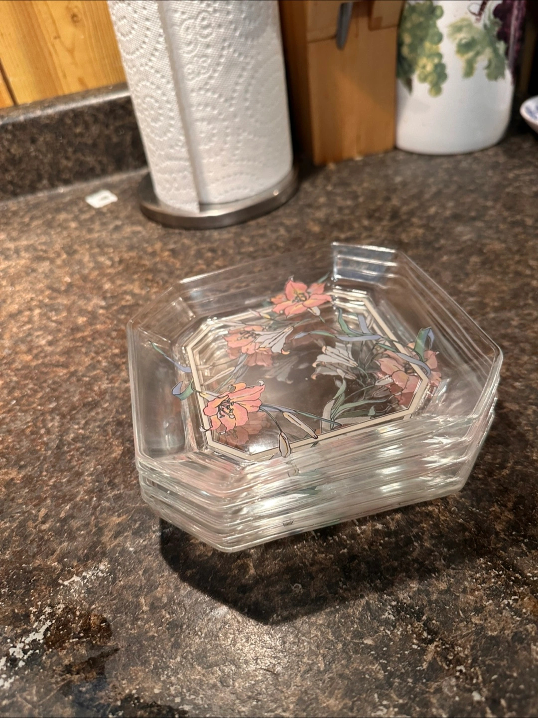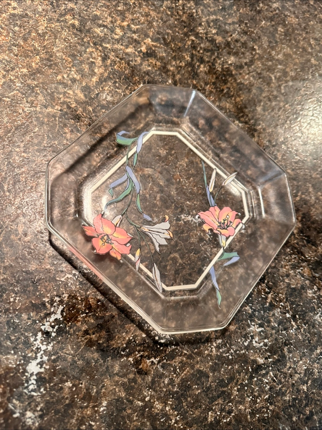 Selling a lovely floral glass octagon trinket dish! It's perfect for holding small items like jewelry or keys. The floral design adds a touch of elegance to any space. It's in great condition and ready for a new home