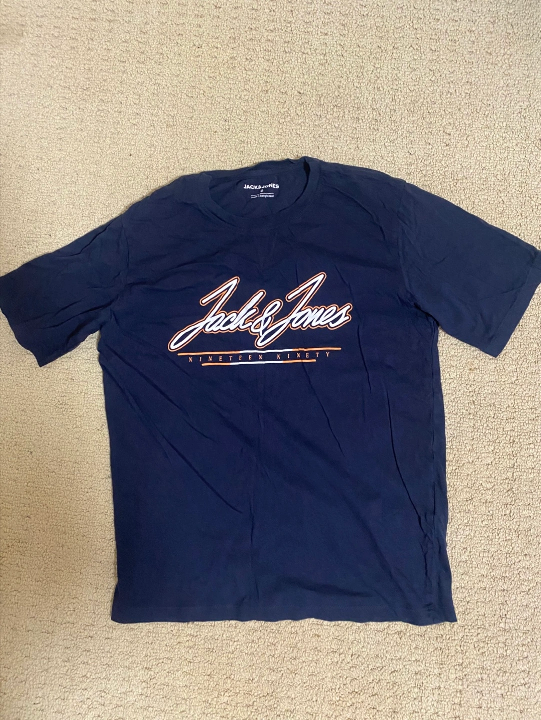 A Jack & Jones T-shirt in size small. It's a nice navy blue colour with the brand's name and 'Nineteen Ninety' printed on the front. Perfect for casual wear!