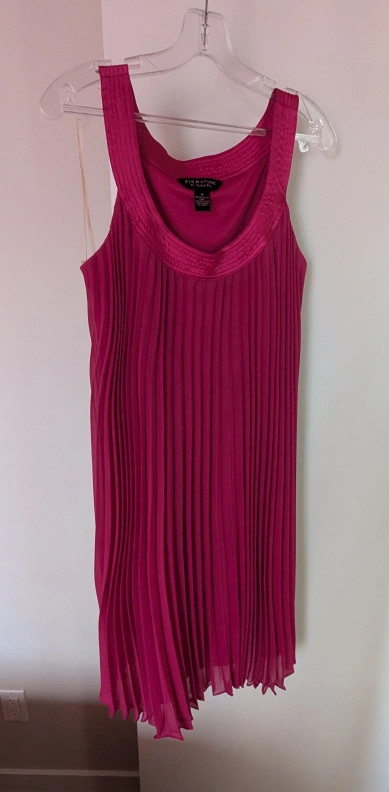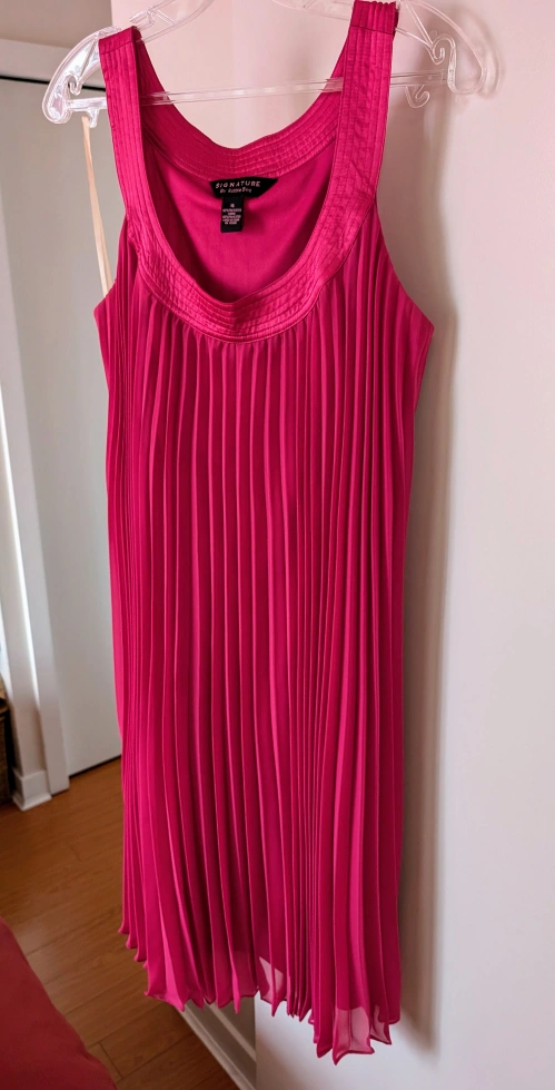 A cocktail dress by Signature in size XL! It's a beautiful shade of pink with a pleated design. Perfect for a special occasion or a night out.