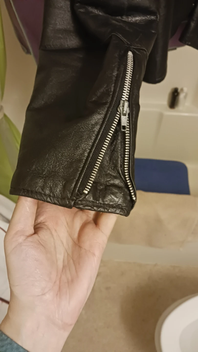 This is a Leather Attic jacket made in Canada. It's genuine leather with a nylon lining and polyester interlining. It has been dry cleaned by leather specialists only it's whole existence. (1980's) The size tag is worn out, but I am 6", was 160 at the time I wore this zipped up. Cash & Pick up only.