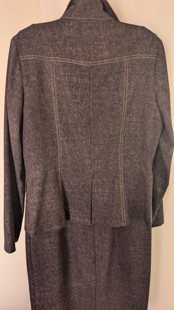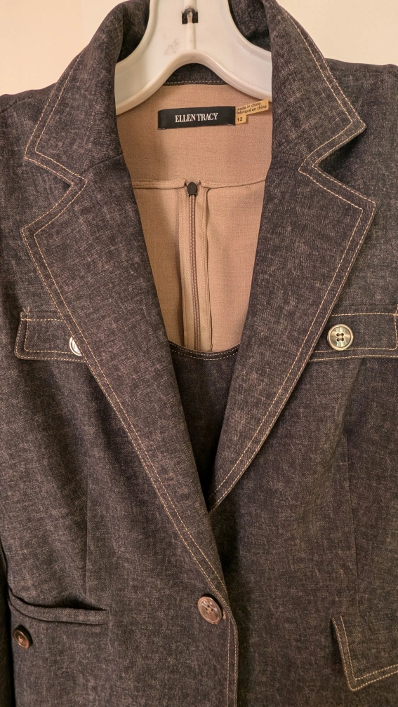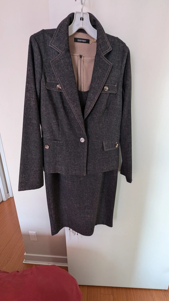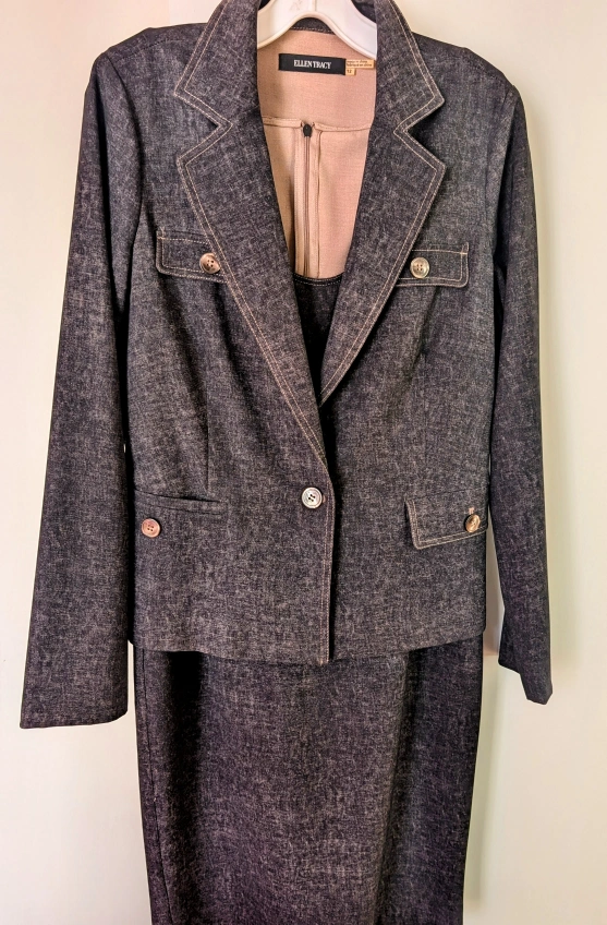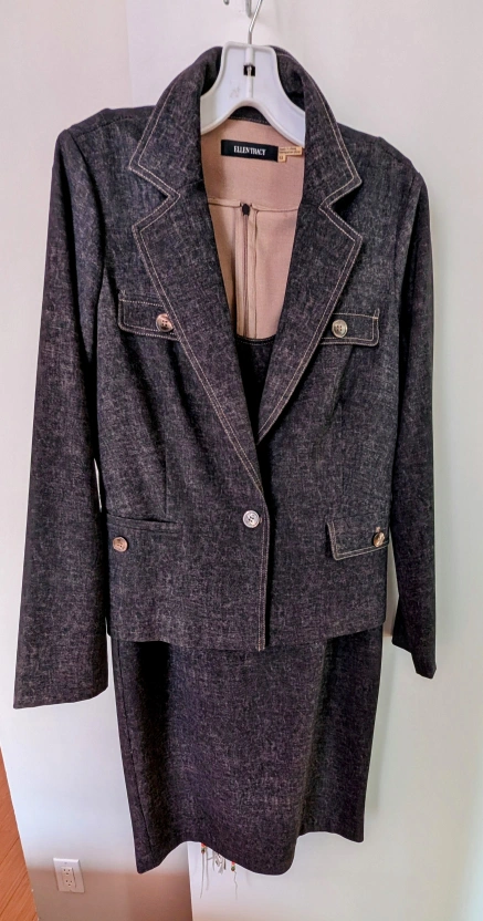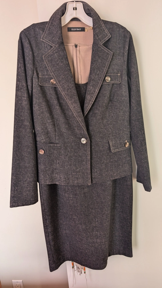 Ellen Tracy dress suit in great condition! The set includes a jacket and a dress, both size 12. The colour is a dark grey. It's a stylish and professional outfit, perfect for work or special occasions! Worn only a couple of times.