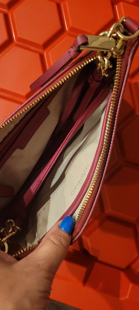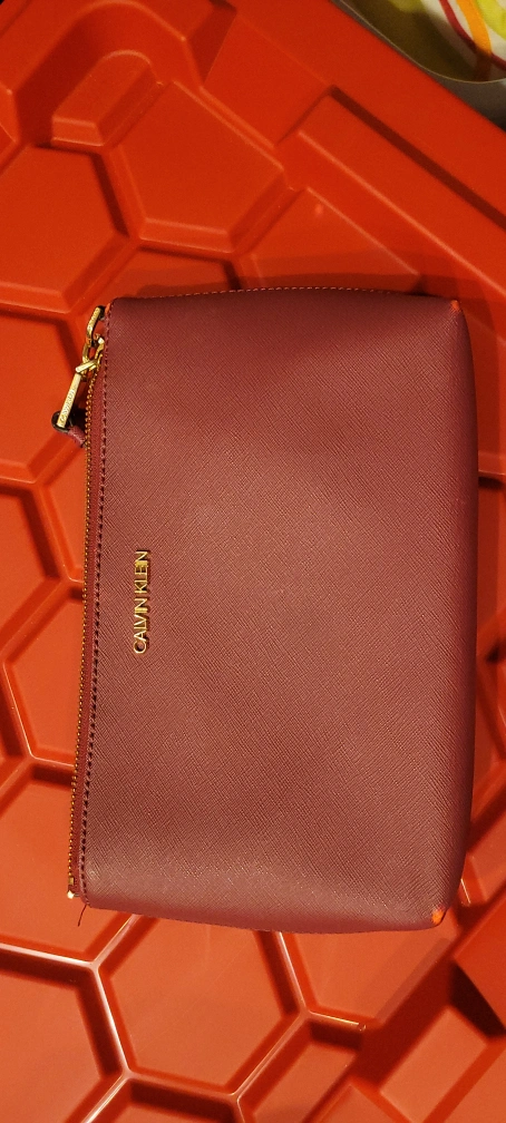 This Calvin Klein wristlet is a stylish and practical accessory. It's a burgundy colour. It's perfect for carrying your essentials on the go