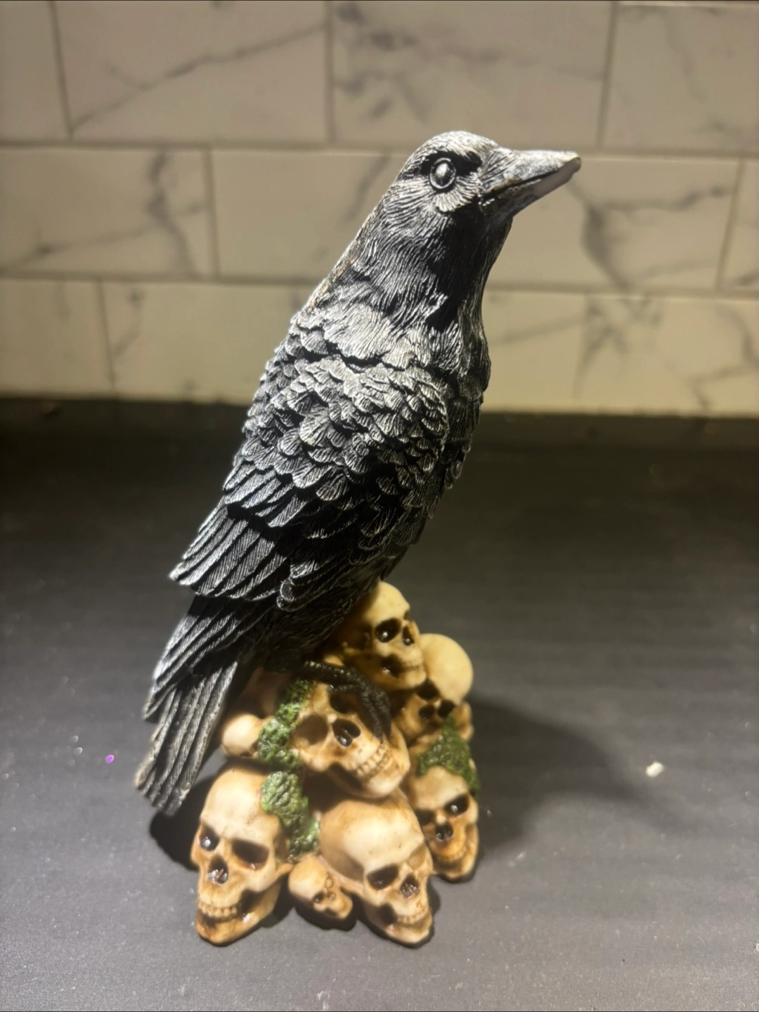 This is a raven perched on a pile of skulls figurine. It would be great for Halloween or for someone who likes gothic decor! The raven is black and the skulls are a bone color.