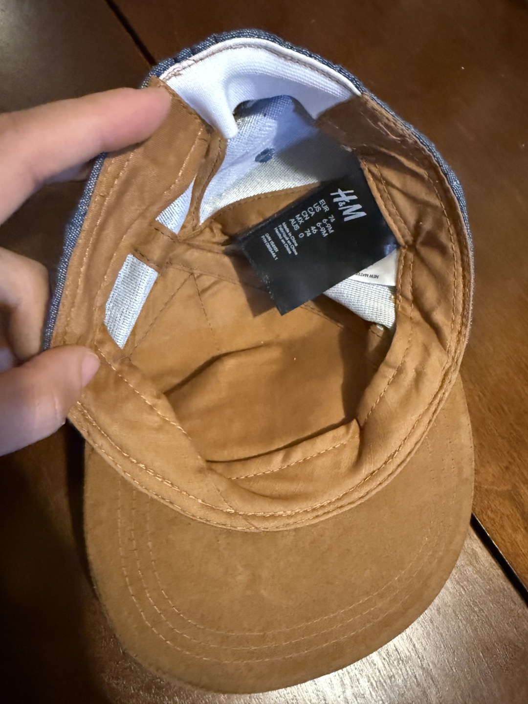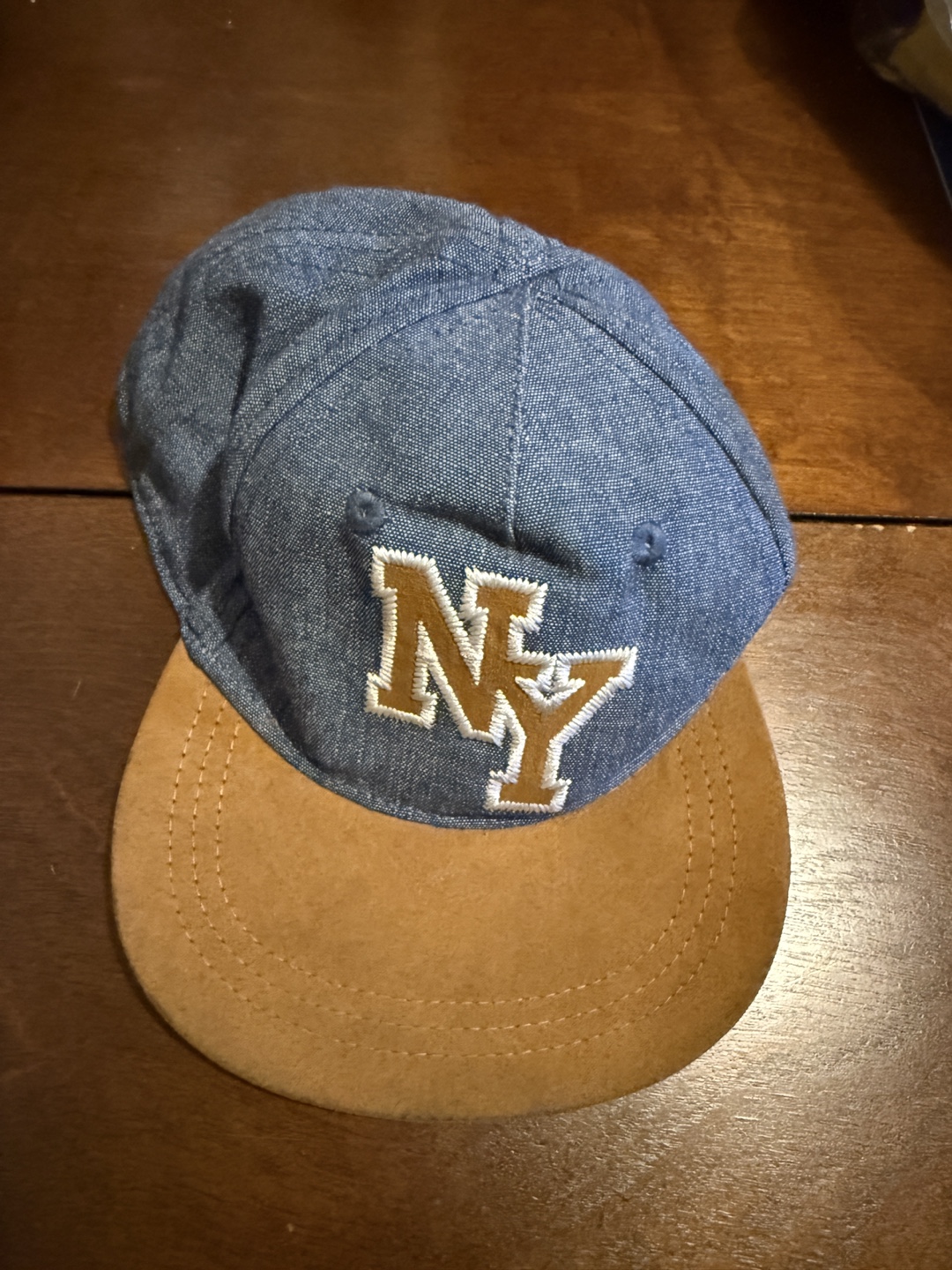 This is a cute H&M kids cap with an "NY" logo. It features a blue denim-like top and a brown suede-like brim. It's in great condition and ready for a new home! For 6 to 9 months old sizes.