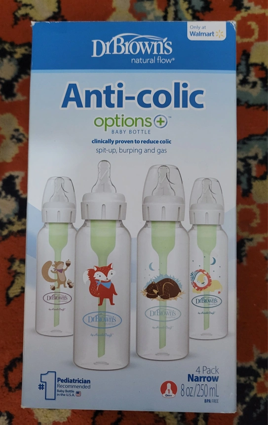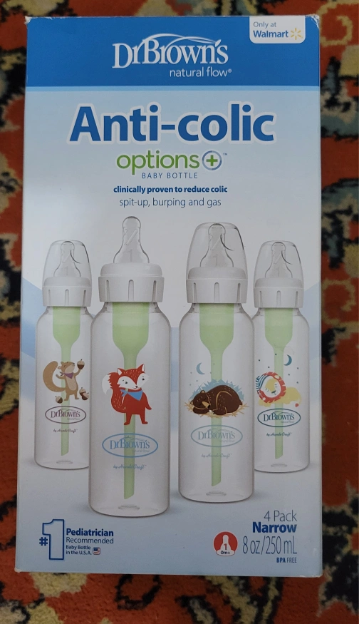 Selling a 4-pack of Dr. Brown's Natural Flow Anti-Colic Options+ baby bottles. These narrow bottles are designed to help reduce colic, spit-up, burping, and gas. Each bottle holds 8 oz / 250 mL and is BPA free. Recommended by pediatricians. Perfect for your little one!