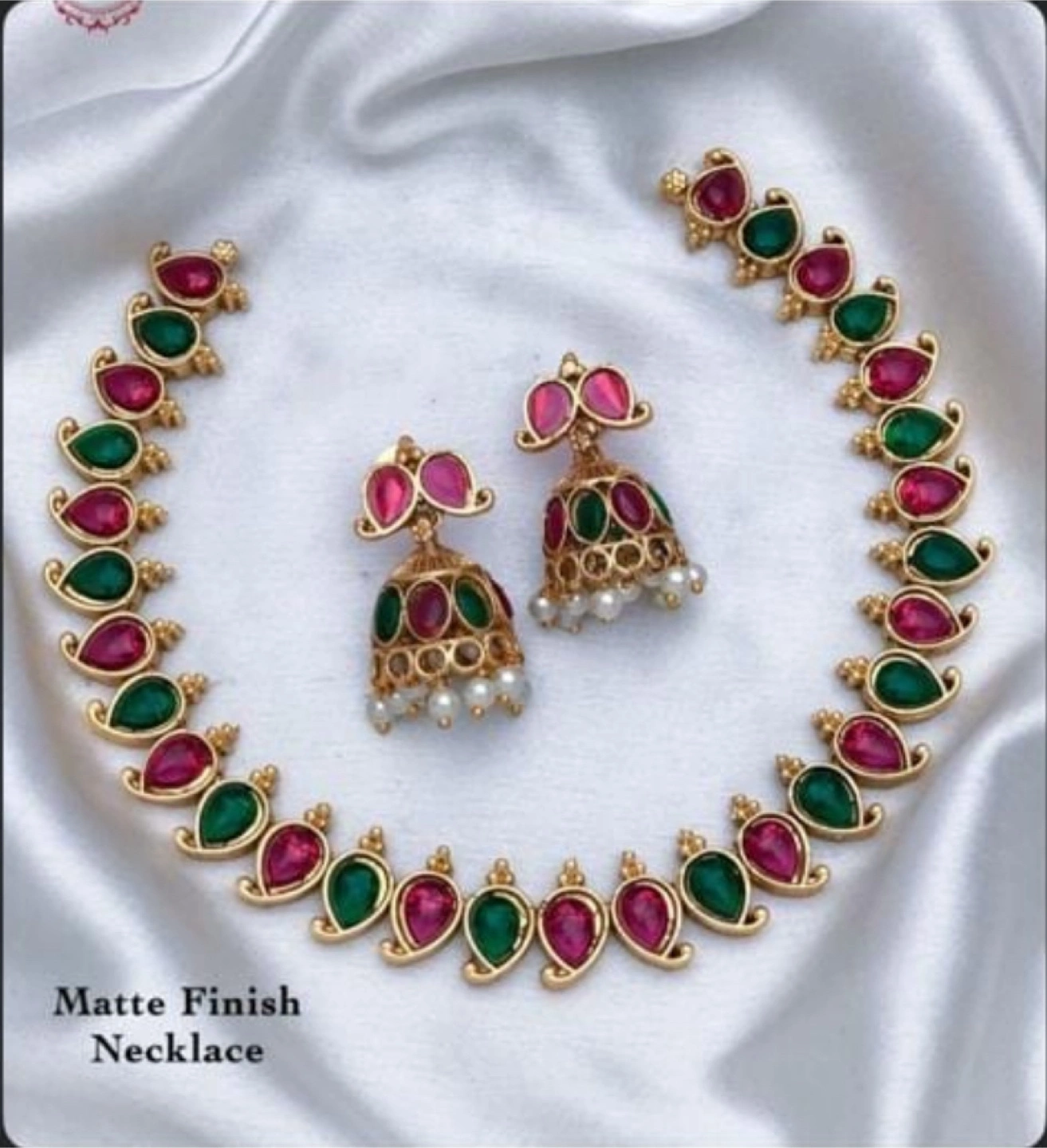 28Beautiful matte finish necklace with matching earrings! The set features a lovely design with pink and green stones. Perfect for adding a touch of elegance to any outfit