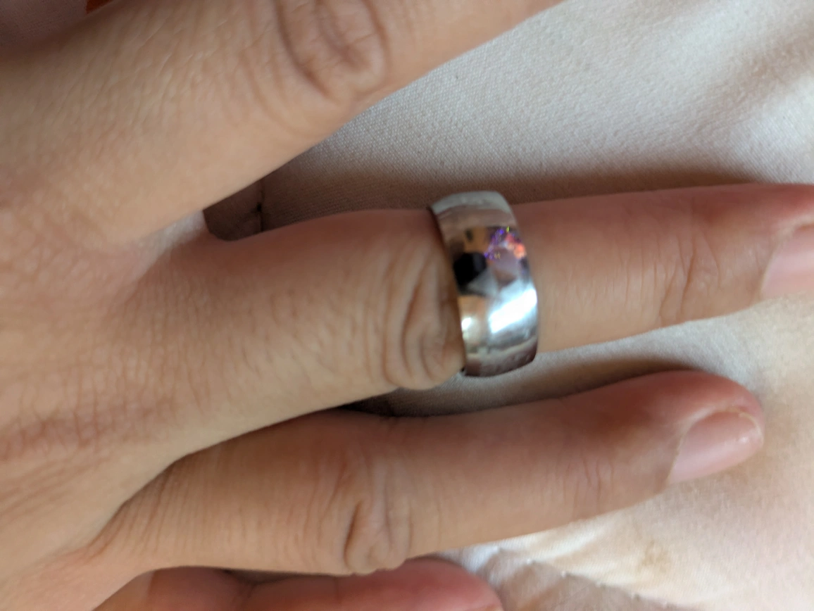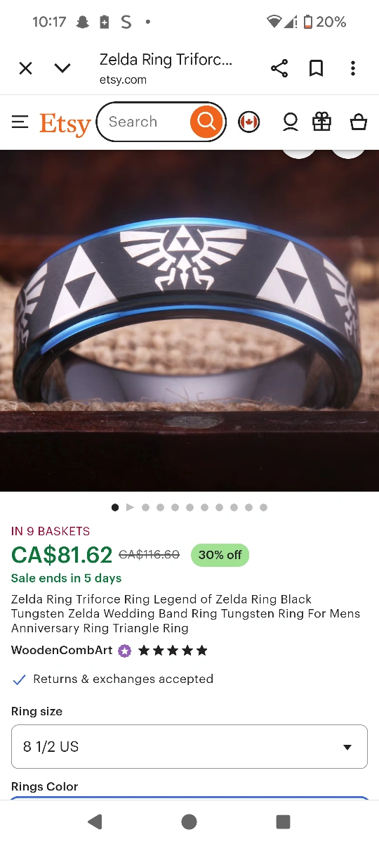 Selling a Zelda Triforce ring! It's appears to be around size 8.5 . but i got it as a gift and never got chance to wear it. It has a black and silver design featuring the Triforce symbol. A great gift for any Zelda fan!