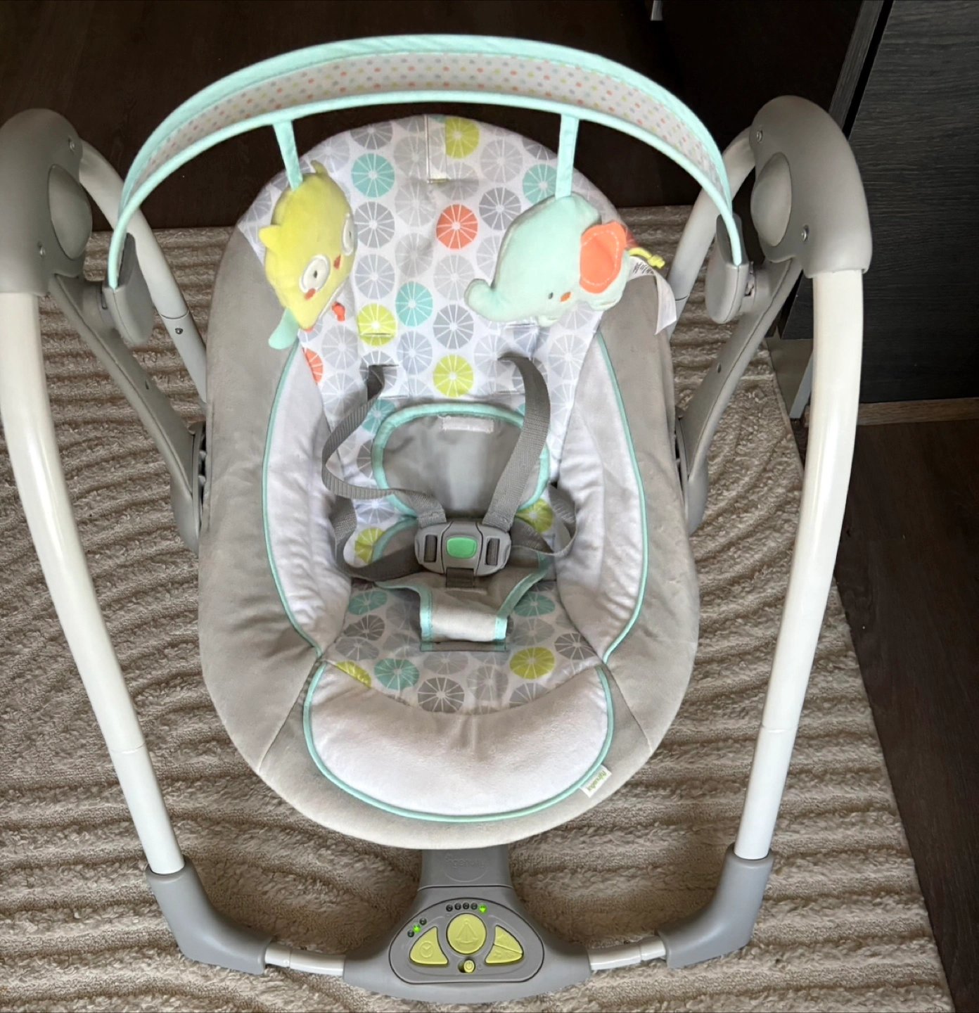 The Ingenuity Swing 'n Go is a lightweight, foldable baby swing with 5 speeds, soothing sounds, timer settings, and long-lasting battery use. It has a washable seat, removable headrest, and comes with two plush toys.