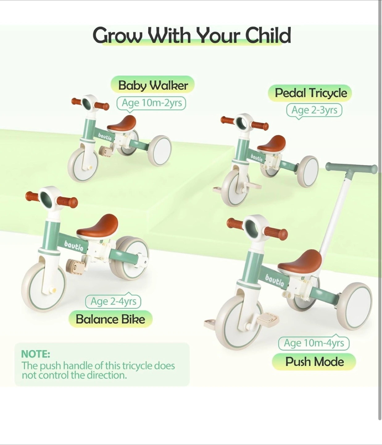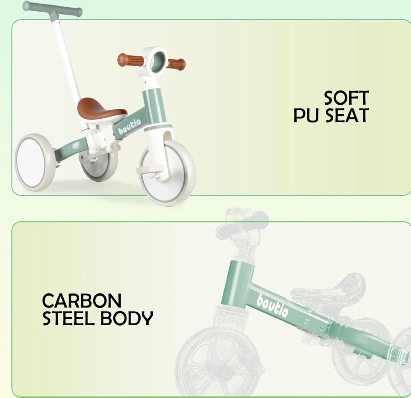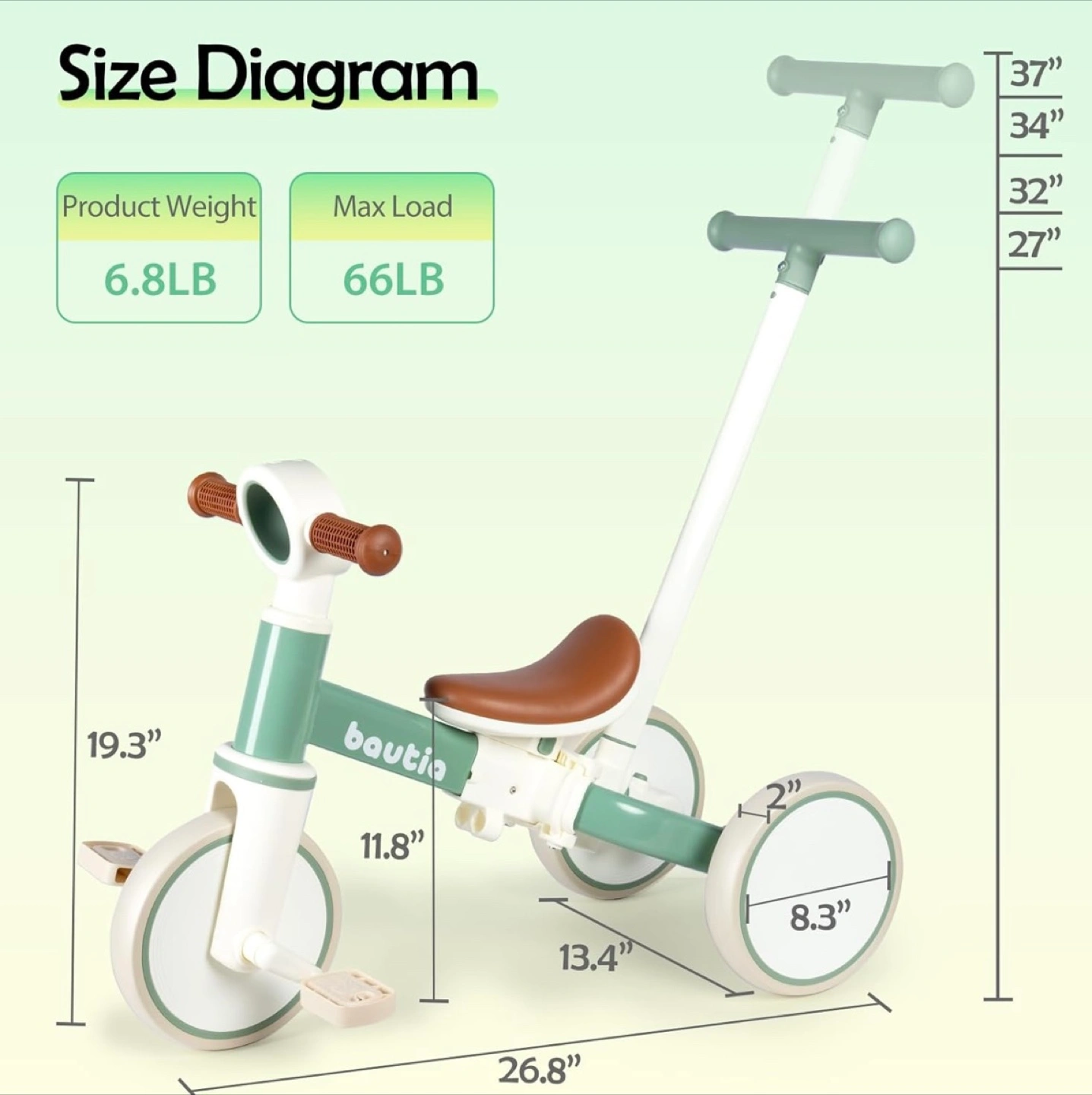Check out this versatile Bautia 4-in-1 tricycle! It easily converts from a baby walker (10m-2yrs) to a balance bike (2-4yrs), a pedal tricycle (2-3yrs), and a push mode trike (10m-4yrs). It's designed to grow with your child! - Product Weight: 6.8 lbs - Max Load: 66 lbs - Safe Limit Steering helps avoid side falls - Easy installation, no tools required