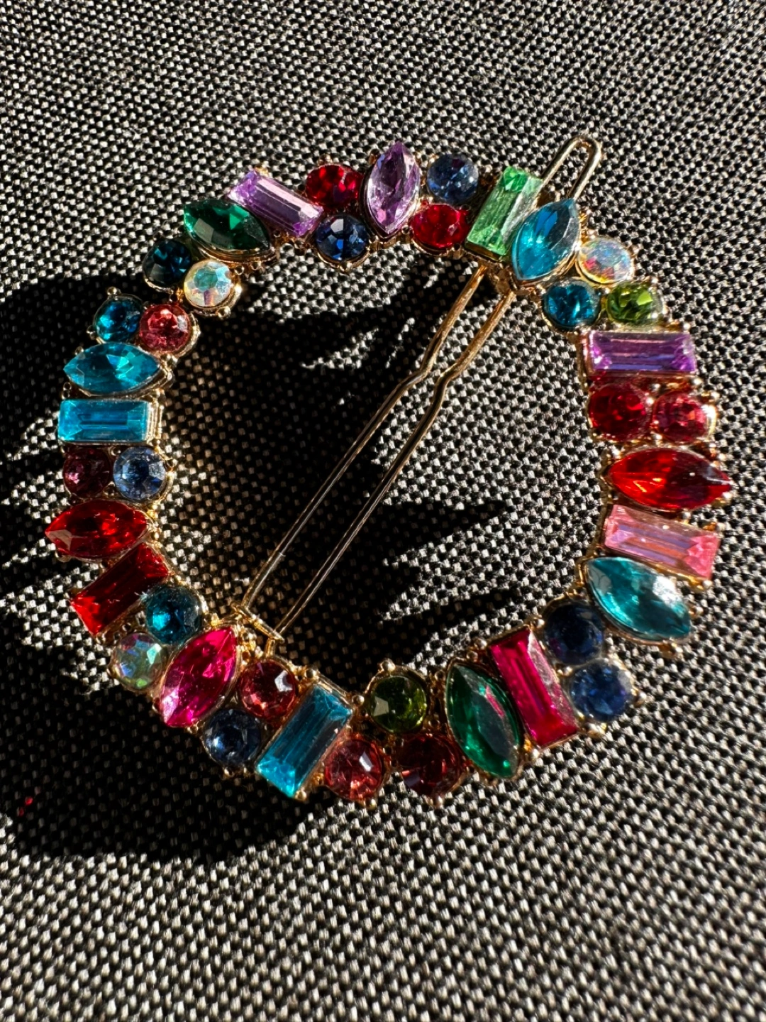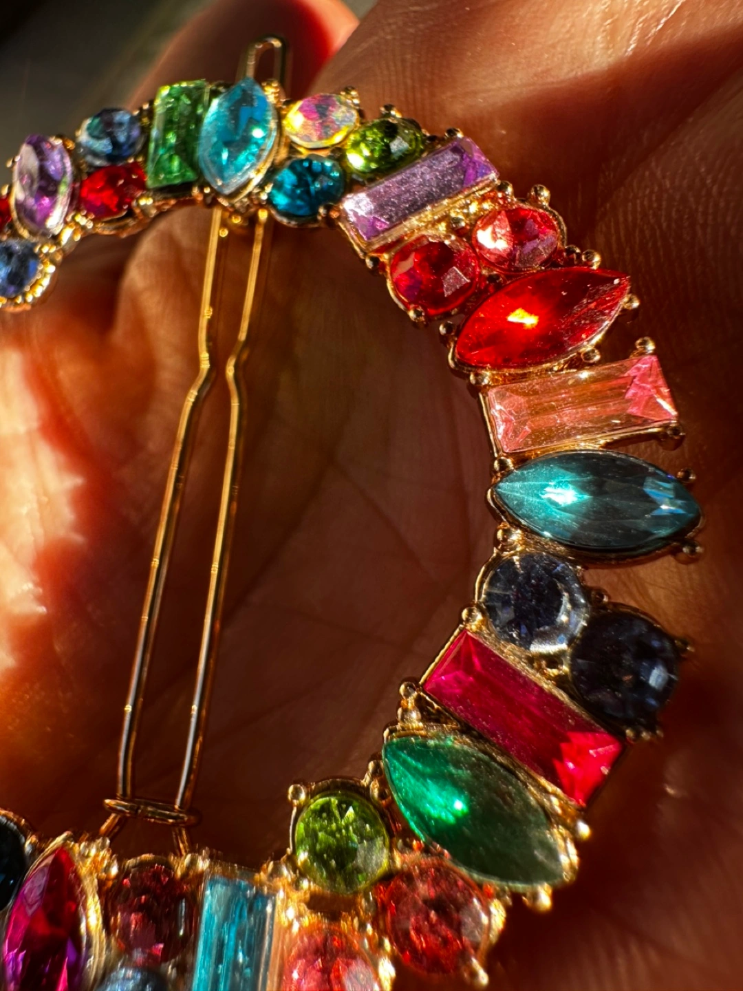 510Add a pop of colour to your hair with this fun rhinestone hair clip! It features a variety of colourful rhinestones set in a gold-tone metal. It's in great condition and ready to add some sparkle to your day! Brand new! Very pretty! Self pickup at Coquitlam Parkway Blvd