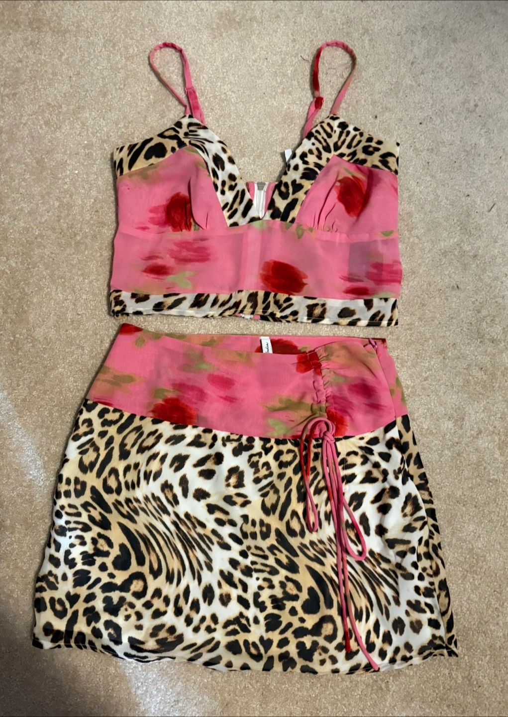 Selling a cute two-piece set featuring a mix of floral and leopard prints! The top has a flattering silhouette, and the skirt has a fun, flirty style. Perfect for a night out or a special occasion. Size 4. Pick up in Chestermere.