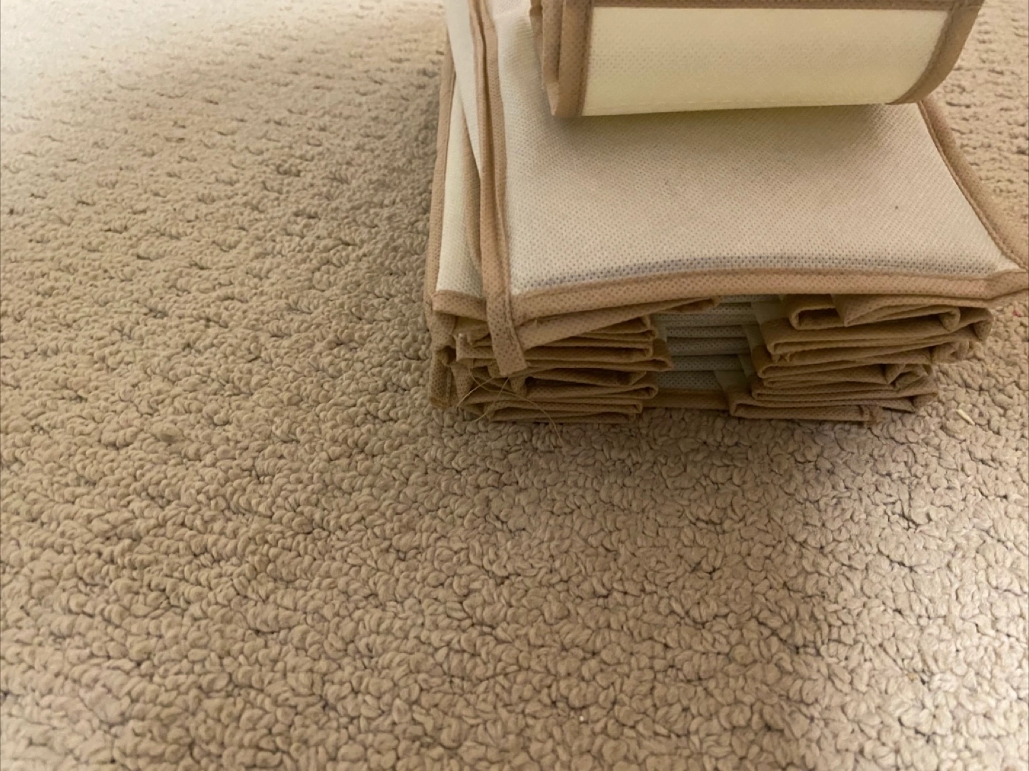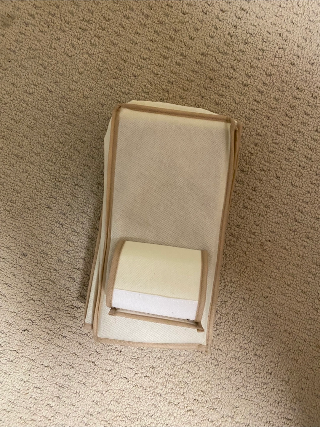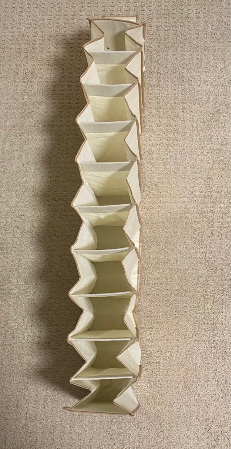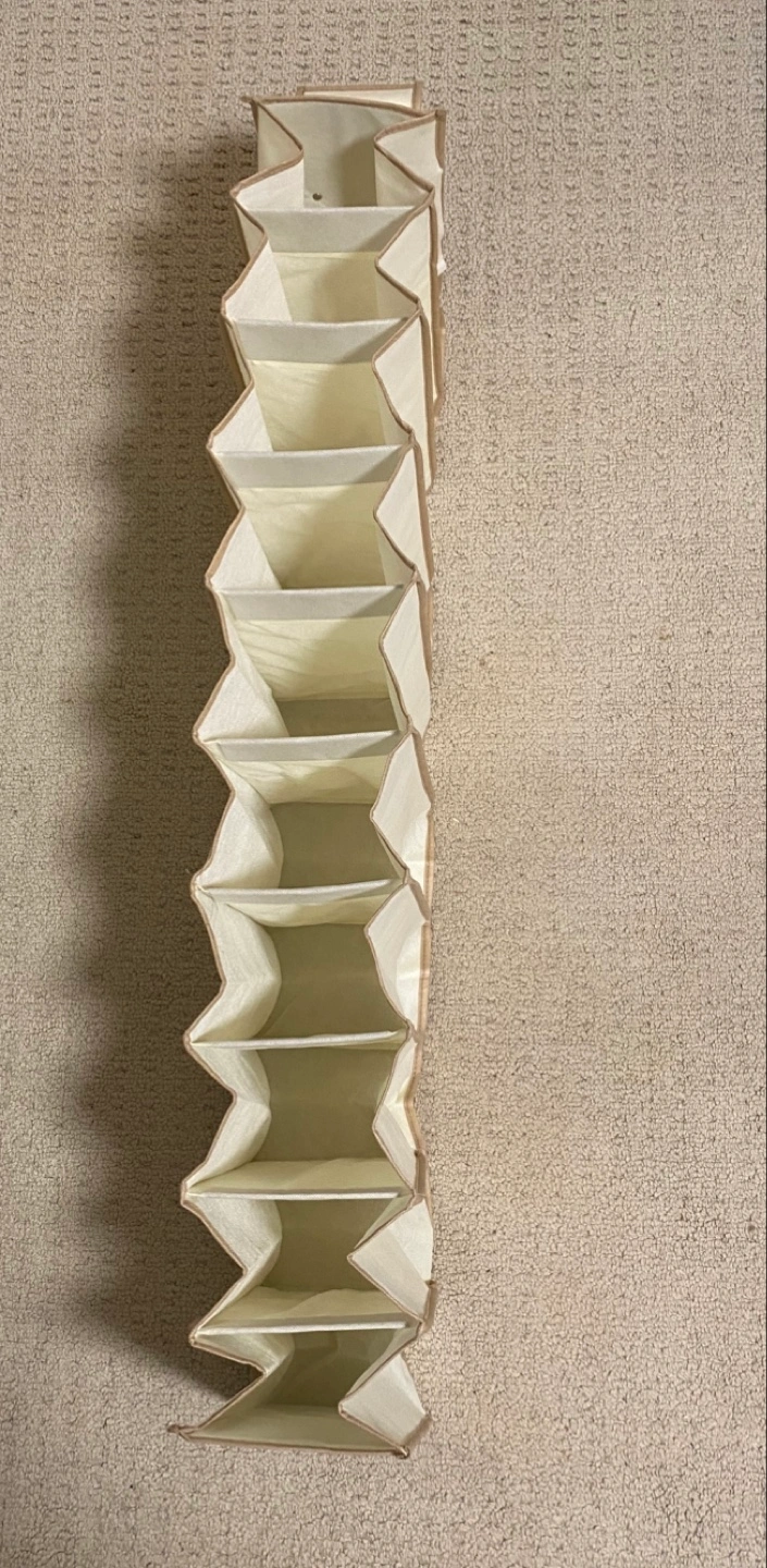 Keep your closet tidy with this beige hanging organizer! It features multiple shelves to maximize vertical storage space. Great for shoes, sweaters, or accessories
