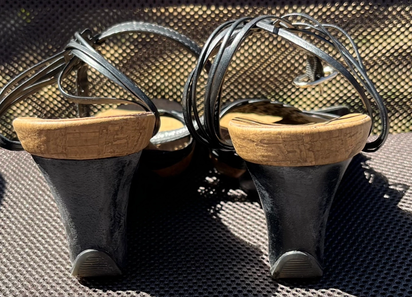 192My wife says these open toe apple cedar wood wedges with straps go great with summer dresses or shorts and I agree. Even though the wood looks ‘tough’, they’re quite soft. Made in Brazil with leather upper, clean all around and ready for a night (or day) on the town. Hardly worn and you can tell by the condition of the durable rubber outsole. Size 7. Edit: found the box!