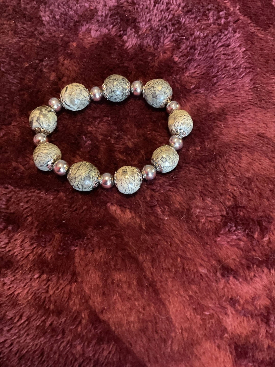Selling a beaded bracelet. It has a unique and stylish look with its round beads and silver accents. It's in great condition and would be a lovely addition to any outfit. This is for a small wrist
