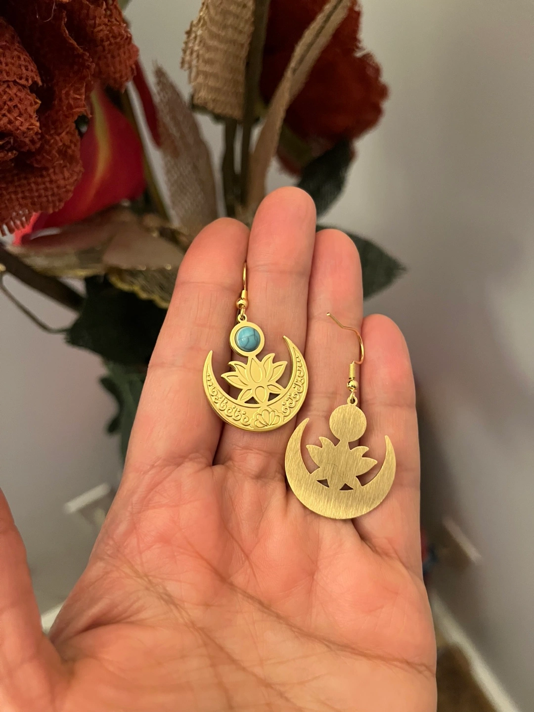 125Cute pair of gold-coloured earrings featuring a lotus flower and moon design. Blue stone in the centre New