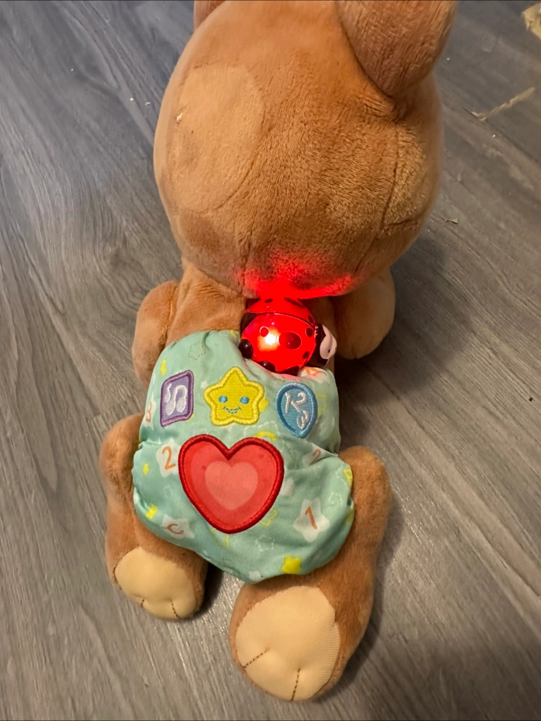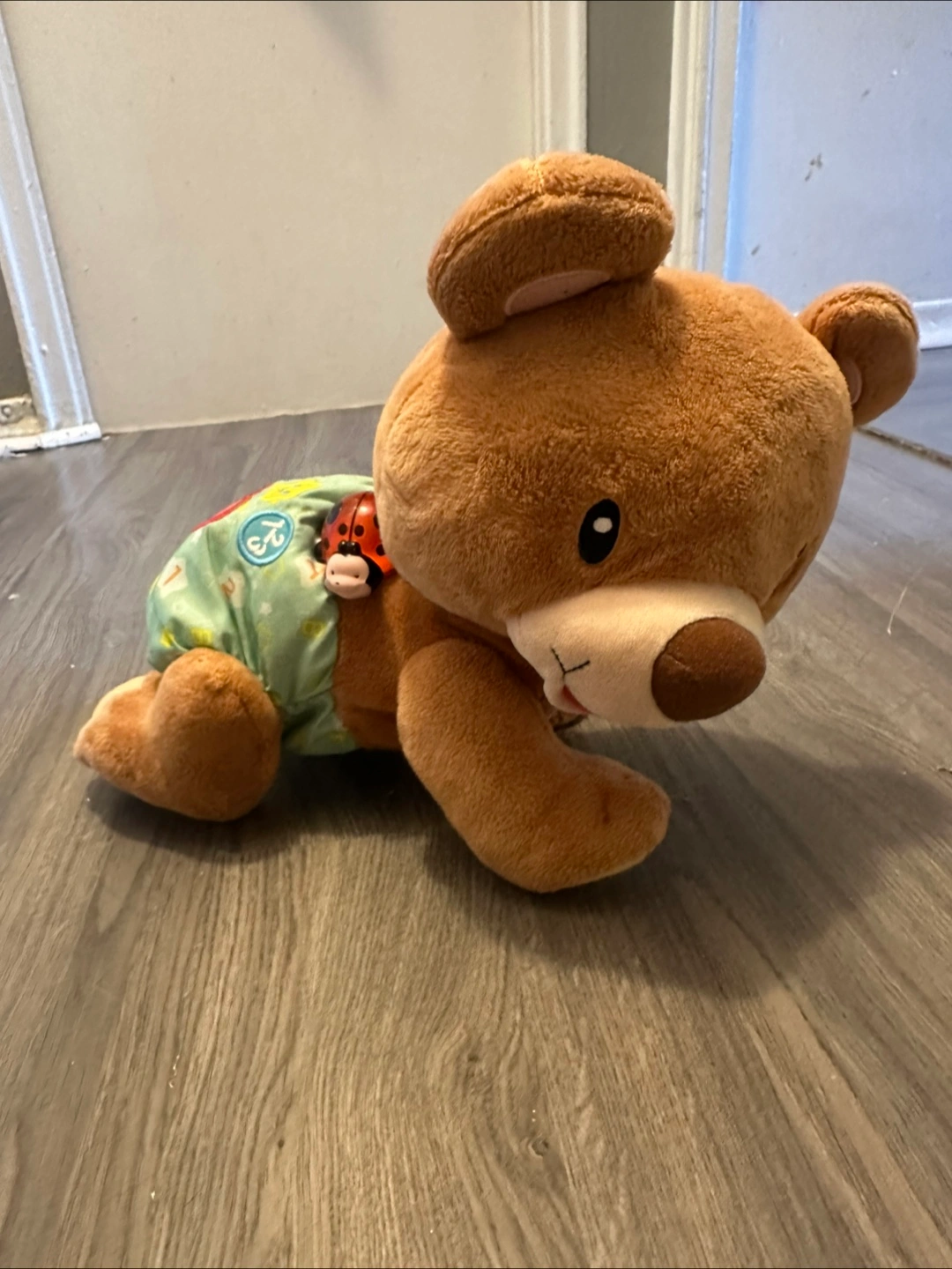 This VTech Crawl & Learn Bear is ready for a new home! It's a fun interactive toy that encourages your little one to crawl and explore. The bear has a cute ladybug button and a colourful diaper with shapes and numbers