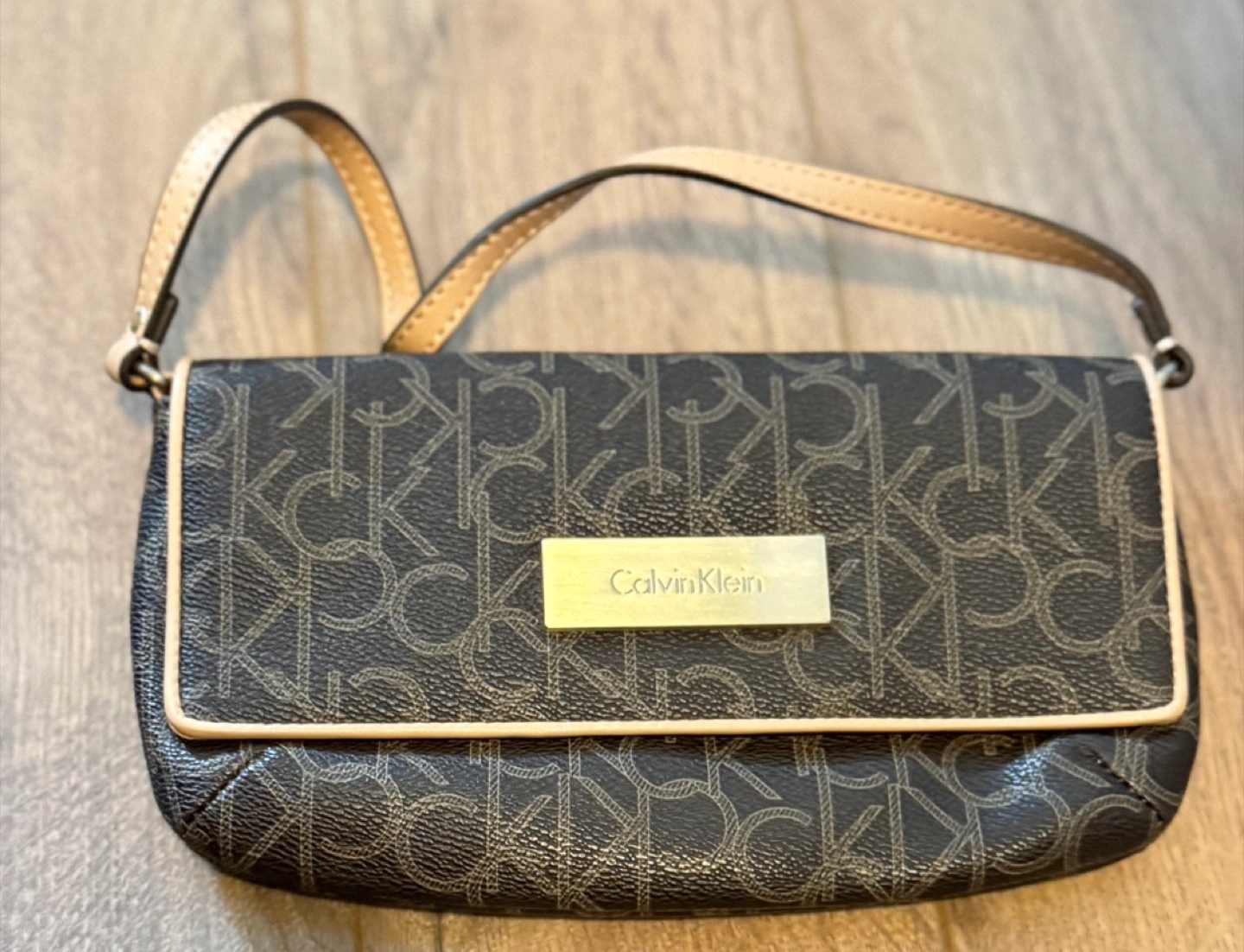 Selling a barely used cute Calvin Klein mini bag with a brown monogram pattern. It features a small handle and a gold-tone Calvin Klein logo plate. Perfect for a night out!