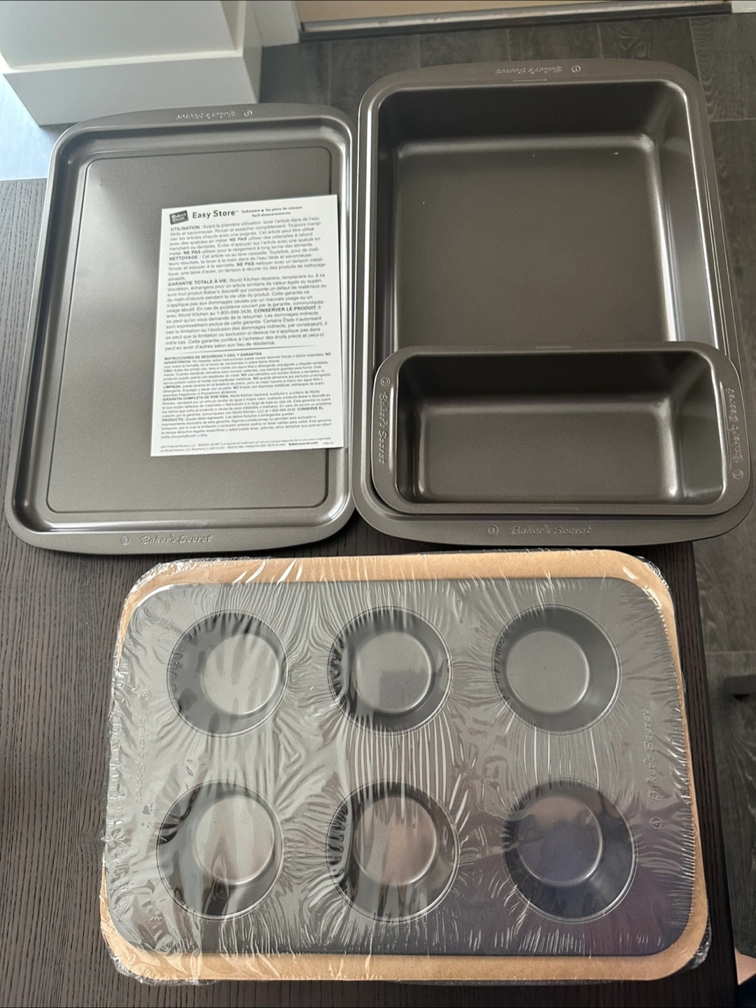 Selling a Baker's Secret Easy Store 5-piece bakeware set. This set includes 2 baking sheets of different depth, a square pan, a loaf pan, and a muffin pan. The muffin pan is still sealed in its original packaging. Perfect for all your baking needs!