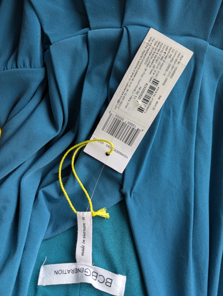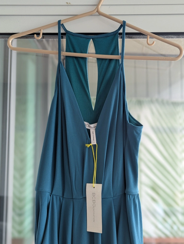 This is a new BCBGeneration dress, still with the tags attached! It's a beautiful teal colour and a size small. Perfect for a night out or a special occasion. The material is soft and flowy, making it super comfortable to wear. Grab it while you can! Has pockets!
