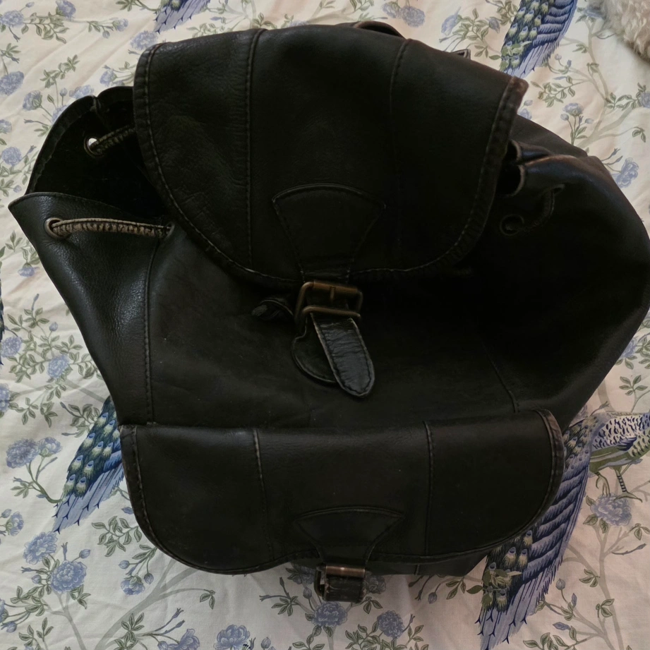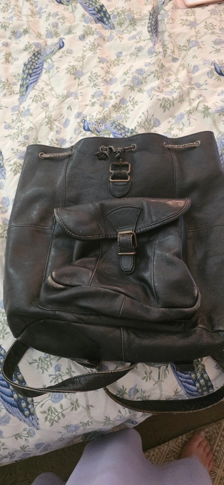 Selling a black leather backpack. It's got a drawstring closure and a flap with a buckle. Great for everyday use! vintage black leather.