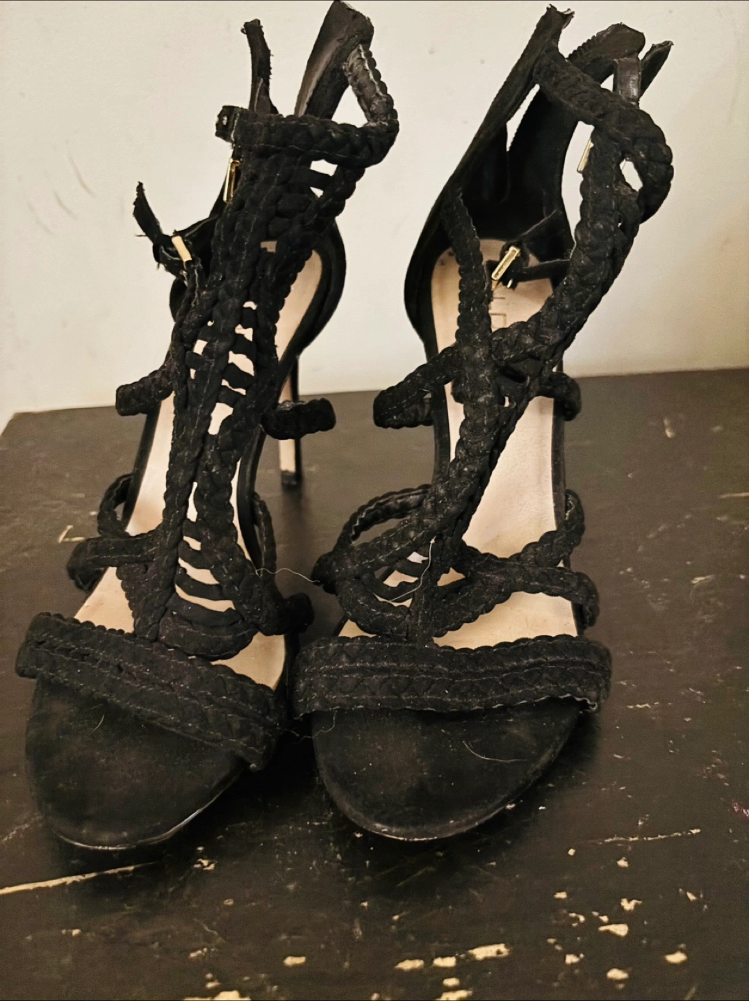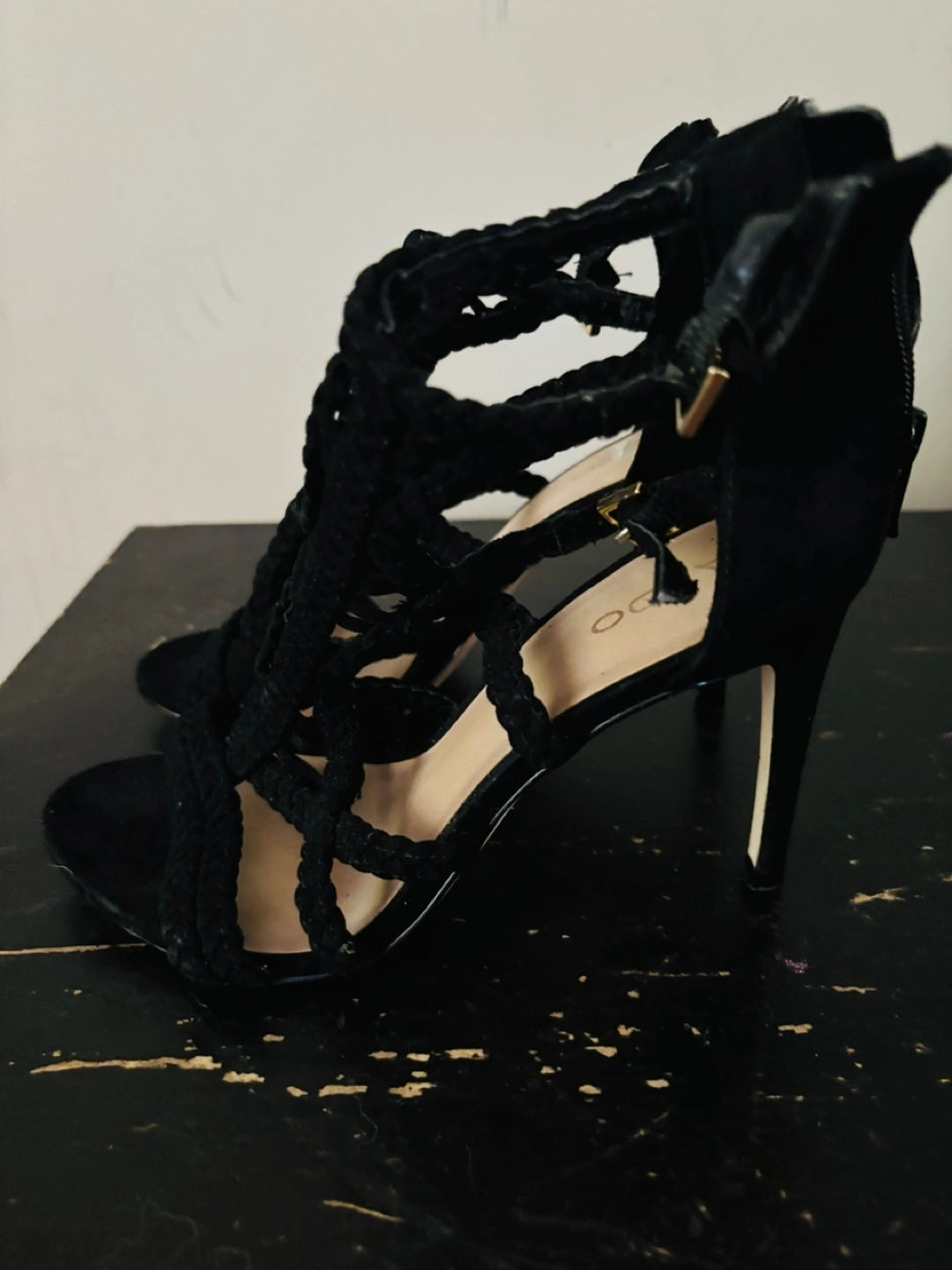 Stylish black Aldo heels in size 7. These heels feature a unique braided design and are perfect for a night out or special occasion. They are in great condition and ready for a new home!