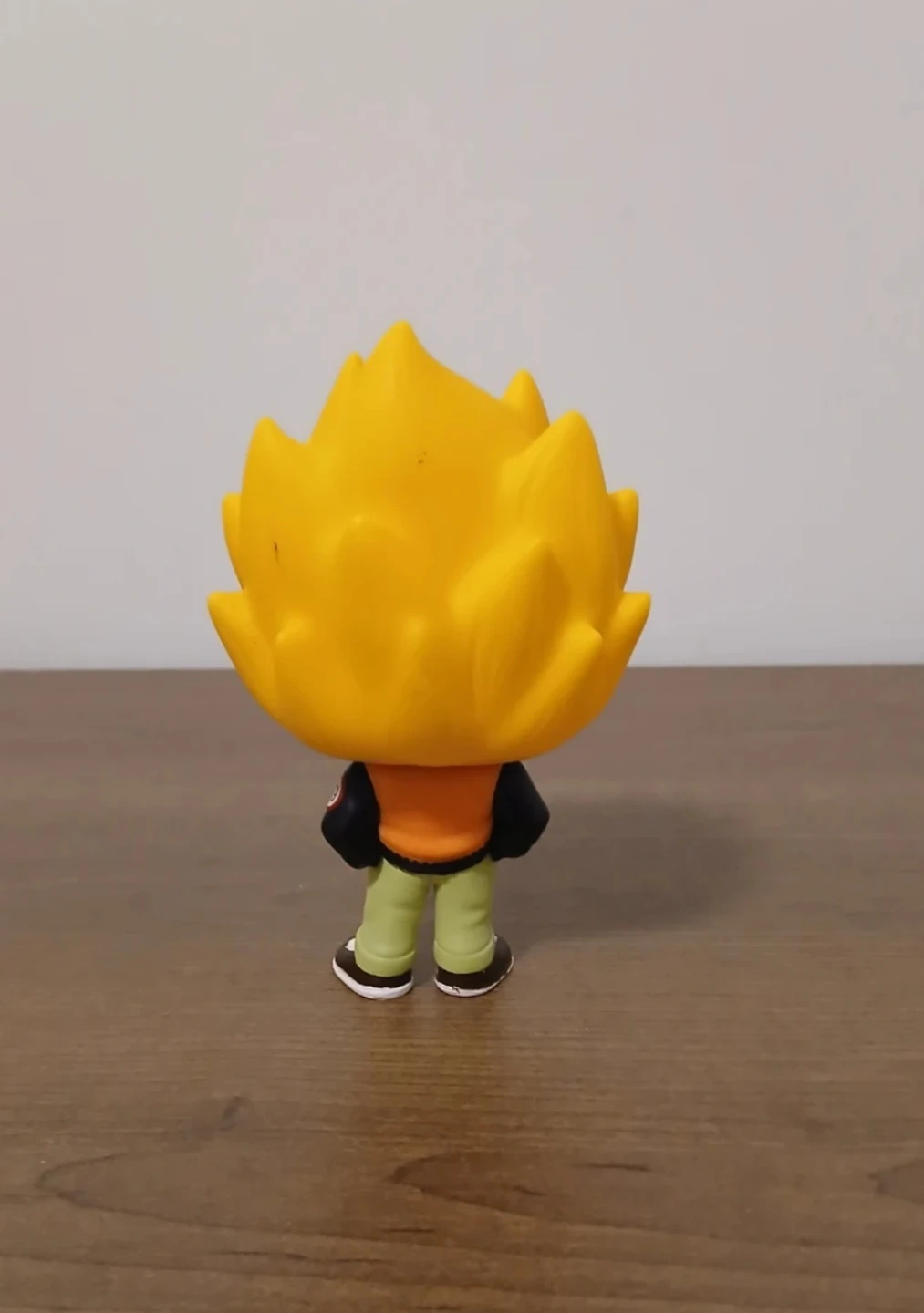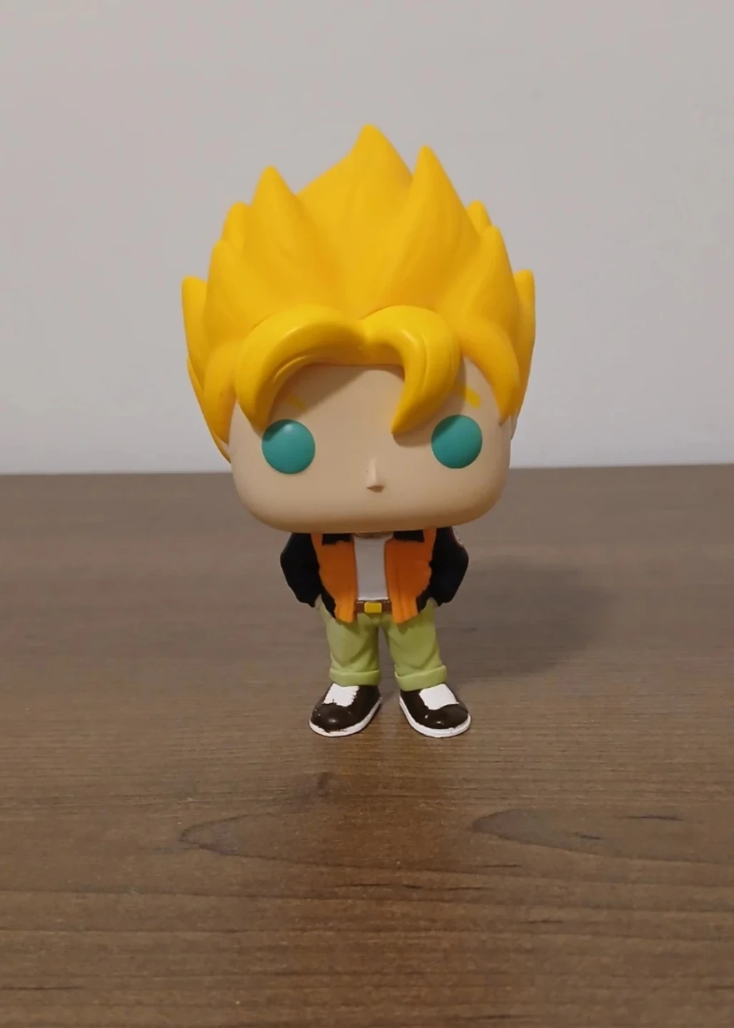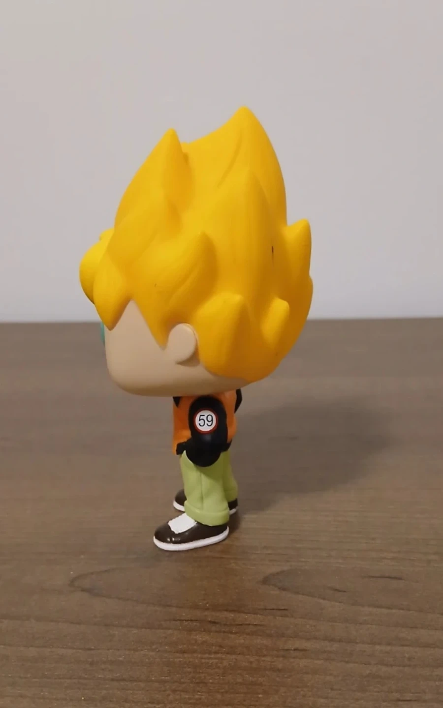 This is a Funko Pop! vinyl figure. It features Son Goku stylized character with bright yellow hair, an orange vest over a white shirt, and green pants.