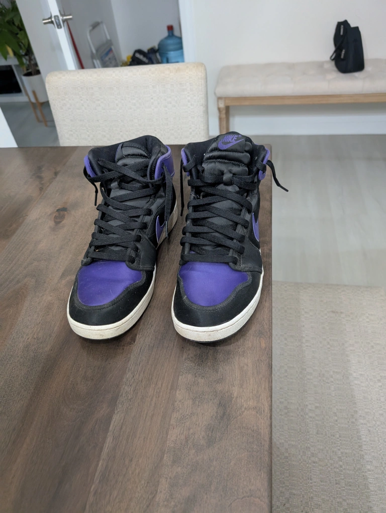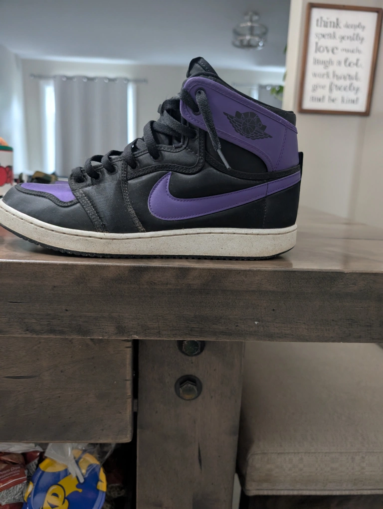 Selling a pair of Nike Air Jordan 1 High sneakers in black and purple! These are in good condition and ready for a new home. hardly worn