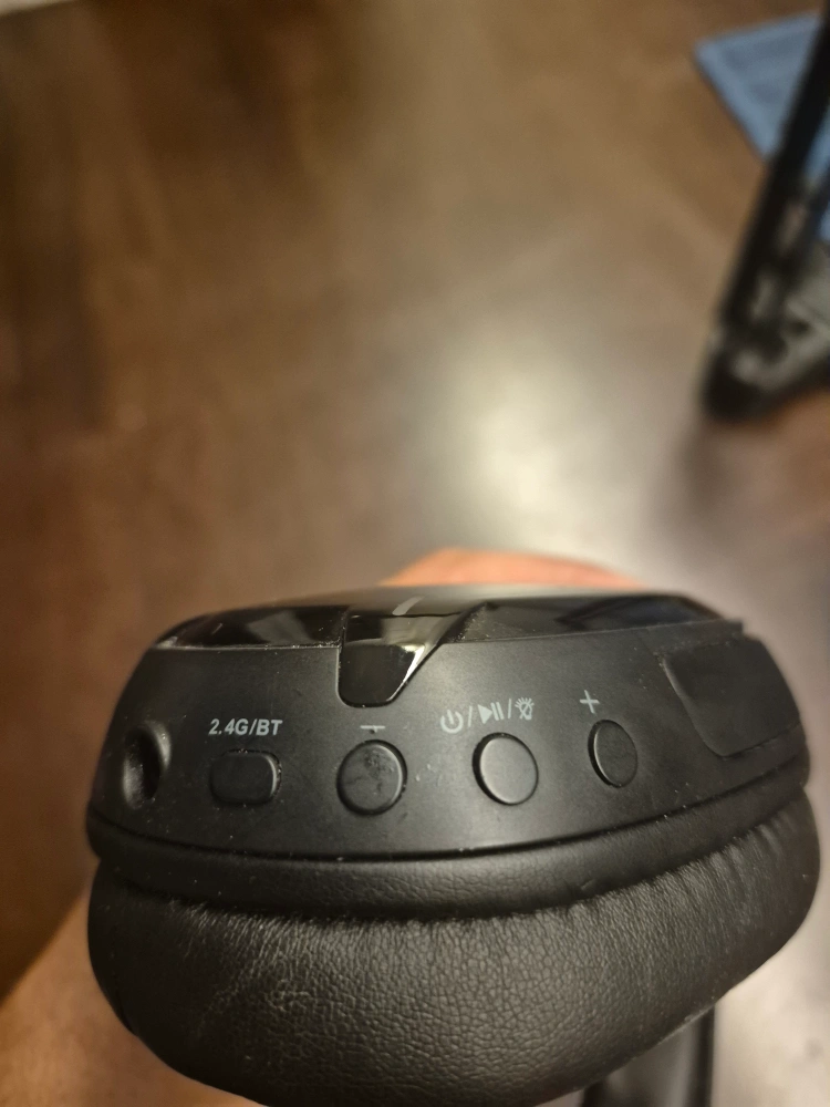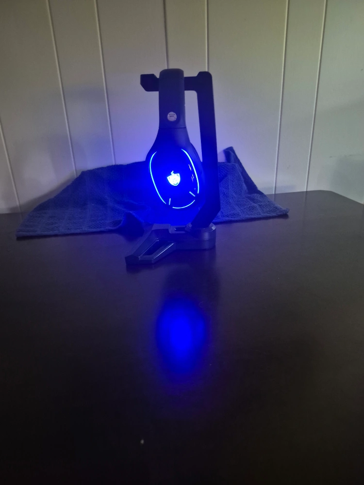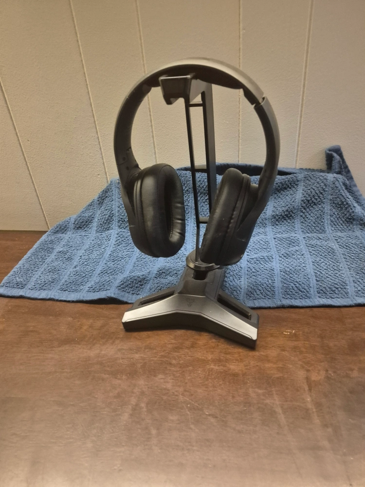Selling a used gaming headset that comes with its own stand. It has a sleek black design and appears to be in good condition. Perfect for gaming or listening to music!