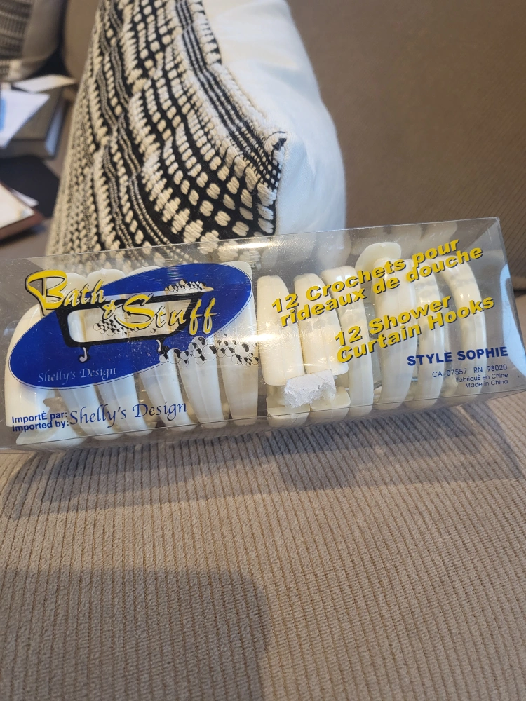 Selling a brand new pack of Bath & Stuff shower curtain hooks! The package includes 12 hooks, perfect for a standard shower curtain. They're in their original packaging and ready to use