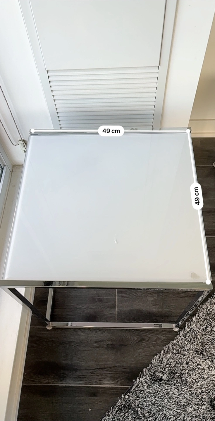 In great condition modern nesting tables with a chrome frame and white glass top. The larger table measures 49cm x 49cm. The smaller one 39cm x 39cm.