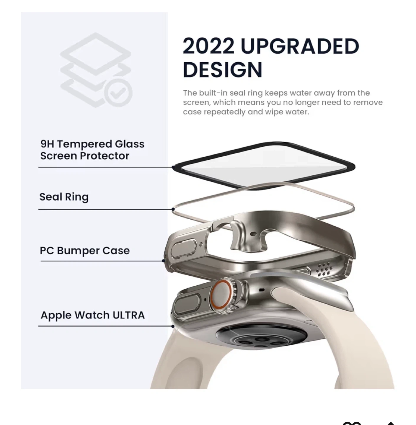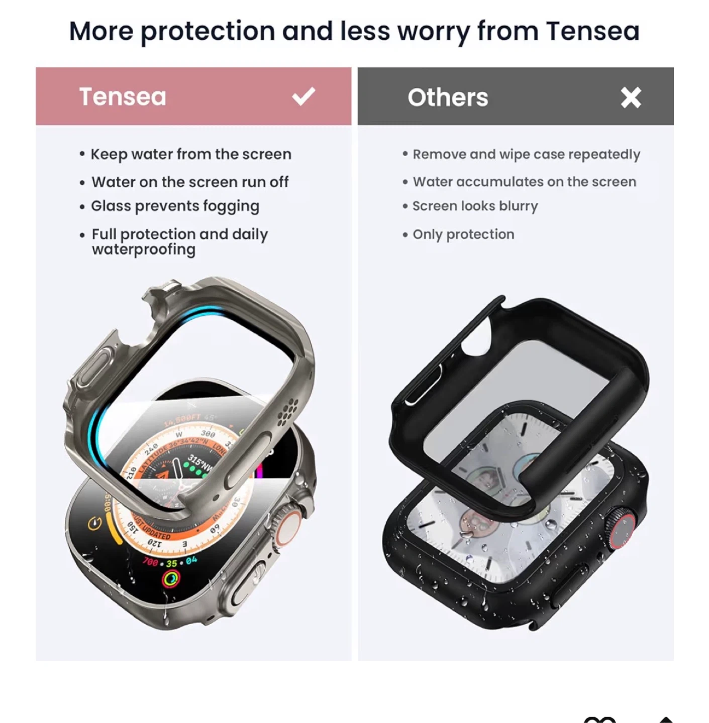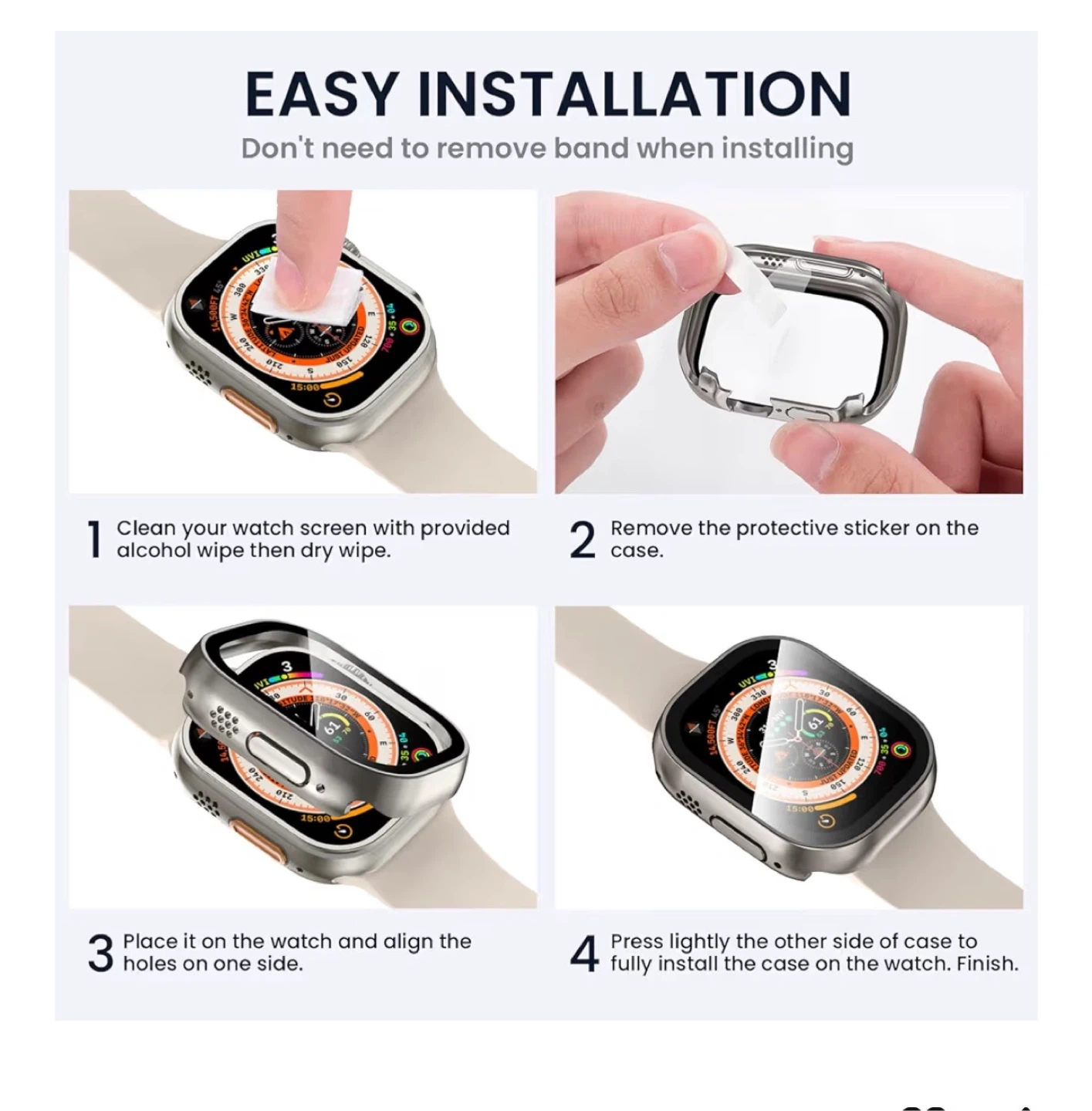 (TIPS): This cases is not waterproof, it doesn¡t support while swimming. If you forgetto take it off, or using this product at gym or sports activities may cause the moisture to be trapped between this product and the watch screen. You just need to wipe with a glasses cloth.