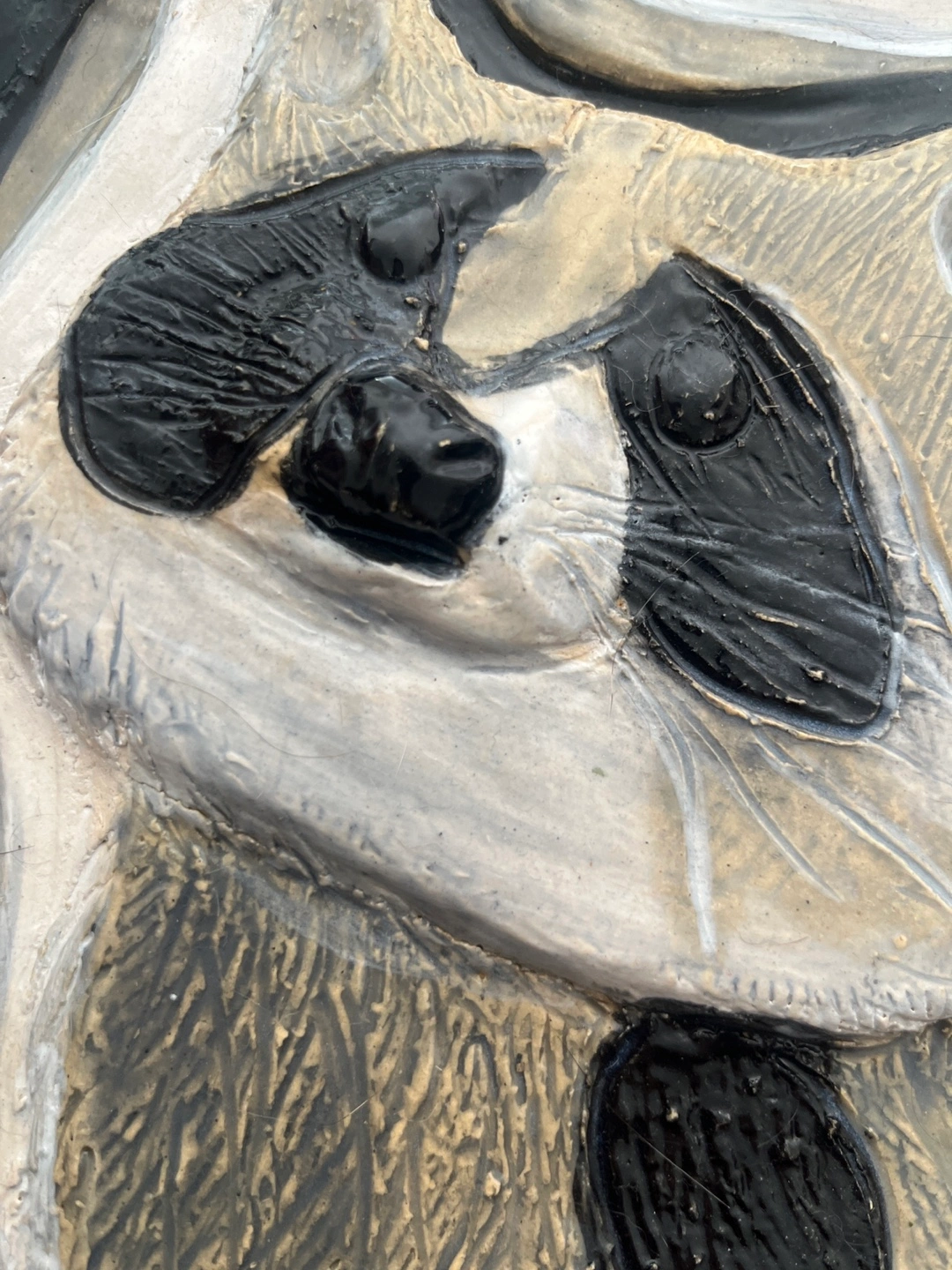This is a piece of artwork. It features a raccoon clay artwork The colours are muted, mostly black, white, and beige, giving it a rustic or handmade feel