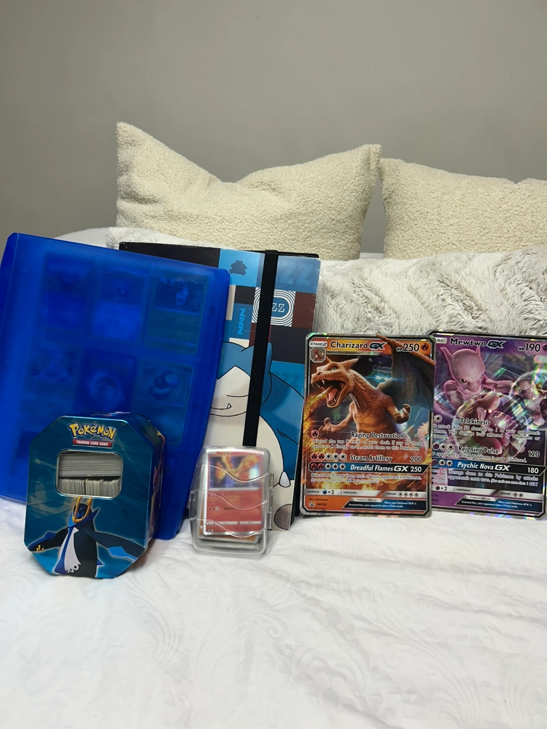 Selling a collection of Pokémon cards featuring Charizard GX and Mewtwo GX. Great for collectors or players! The two binders are full with cards up for offers