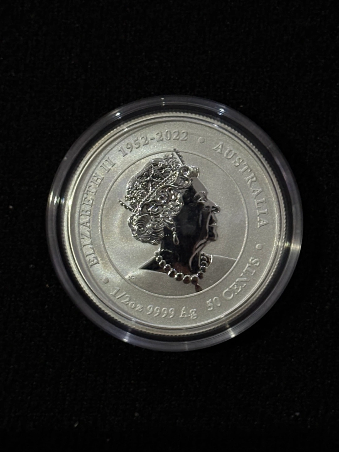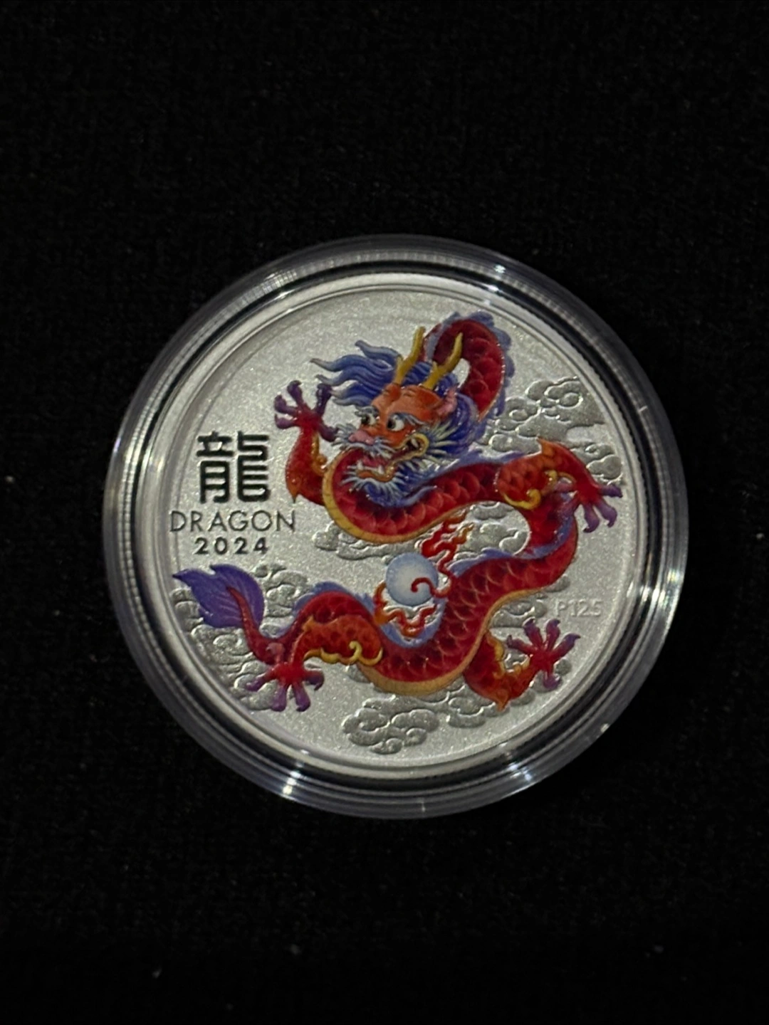 Selling a 2024 Dragon 1/2oz 9999 Ag silver coin. It features a beautiful dragon design on one side and Queen Elizabeth II on the other. A great addition to any collection!