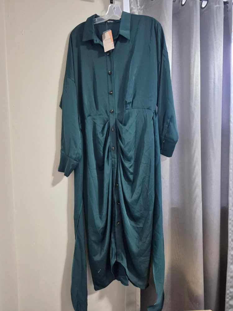 Selling a SheIn green satin shirt dress in size XL. It features a button-down front and a stylish cinched detail at the waist. Perfect for a night out or a special occasion!