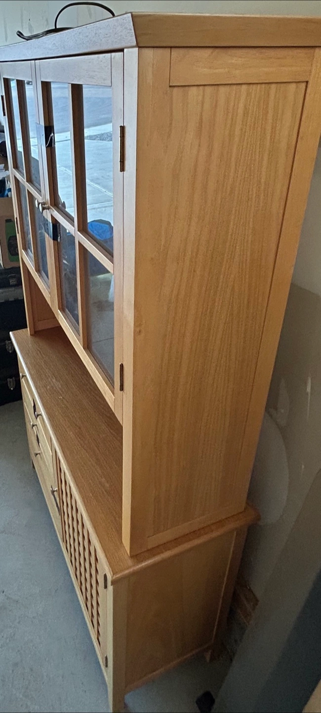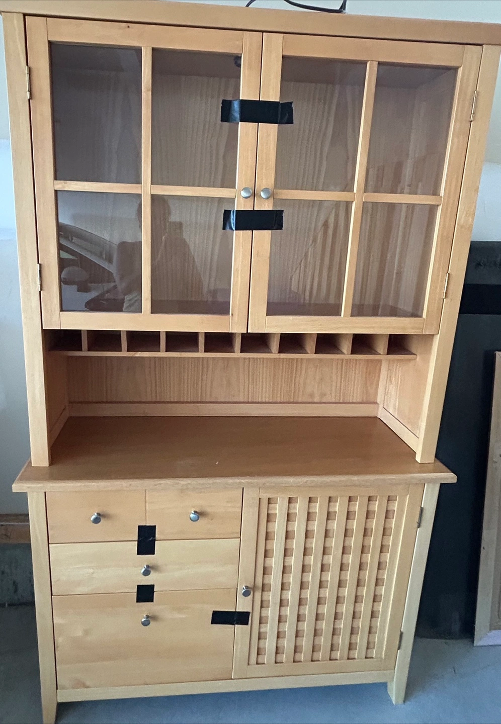 Selling a wooden hutch with glass doors. It's a great piece for displaying items or storing things away. The hutch features drawers, a cabinet, and a wine rack area. It's in good condition and ready for a new home!