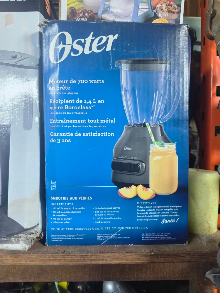 78Selling an Oster blender with a 700-watt motor! It can easily crush ice. The blender has a 1.4 L Boroclass glass container that's dishwasher safe.