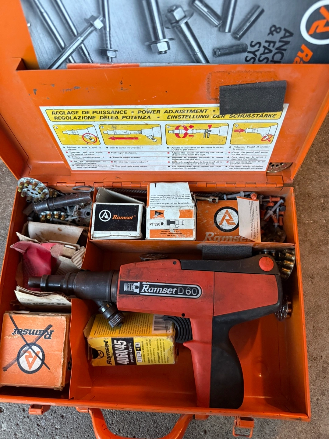 Selling a Ramset D60 powder actuated tool with its original case and some accessories. It looks like it's in good working condition. Please see photos for details!