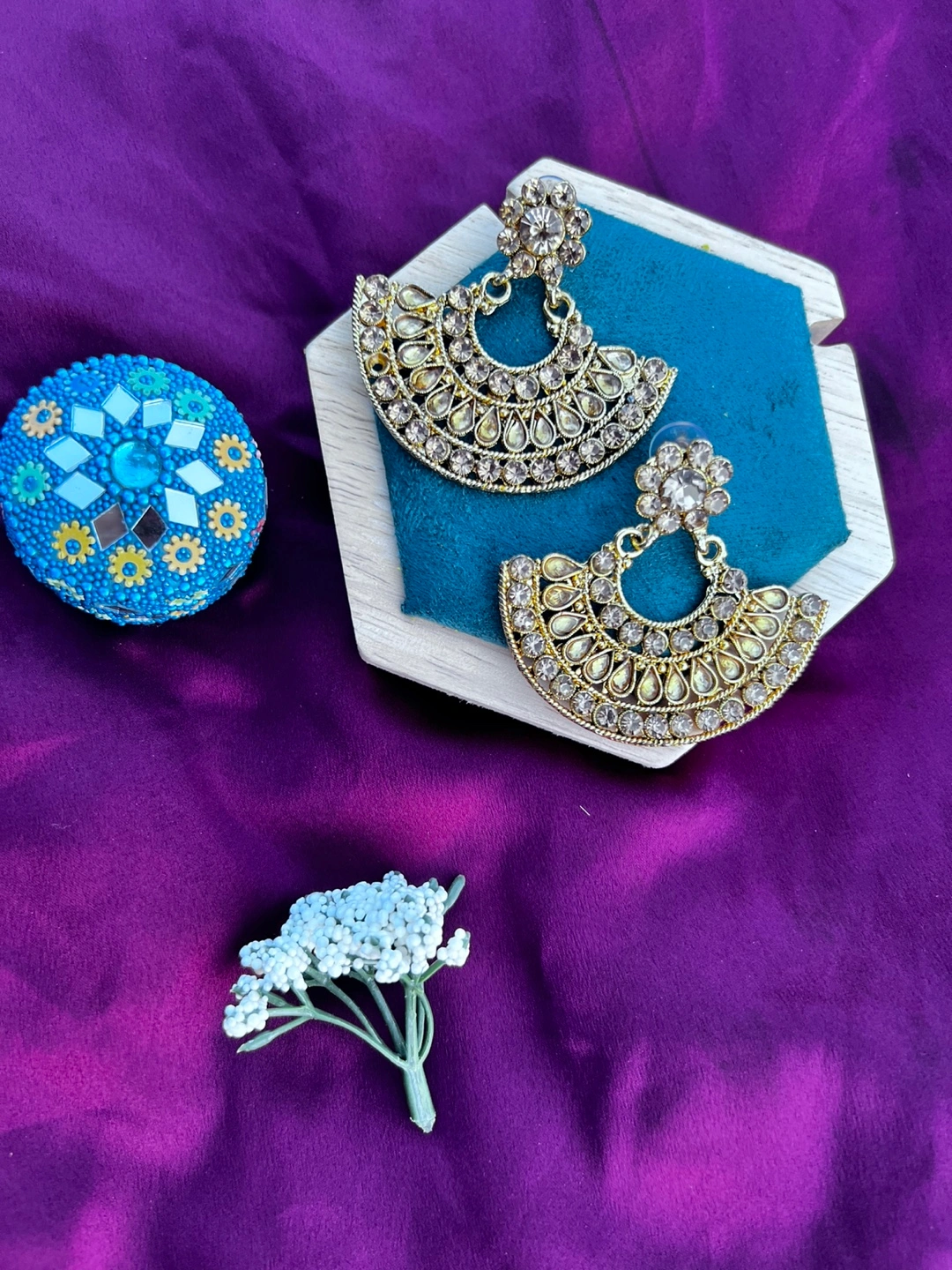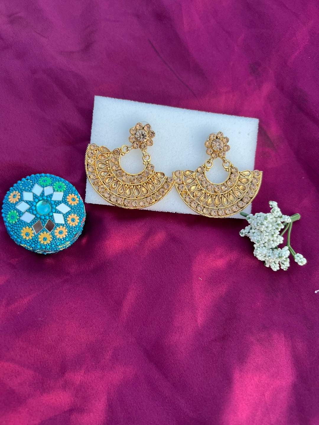 Selling a pair of gold-coloured fashion earrings. They have a beautiful, intricate design. Perfect for adding a touch of elegance to any outfit!