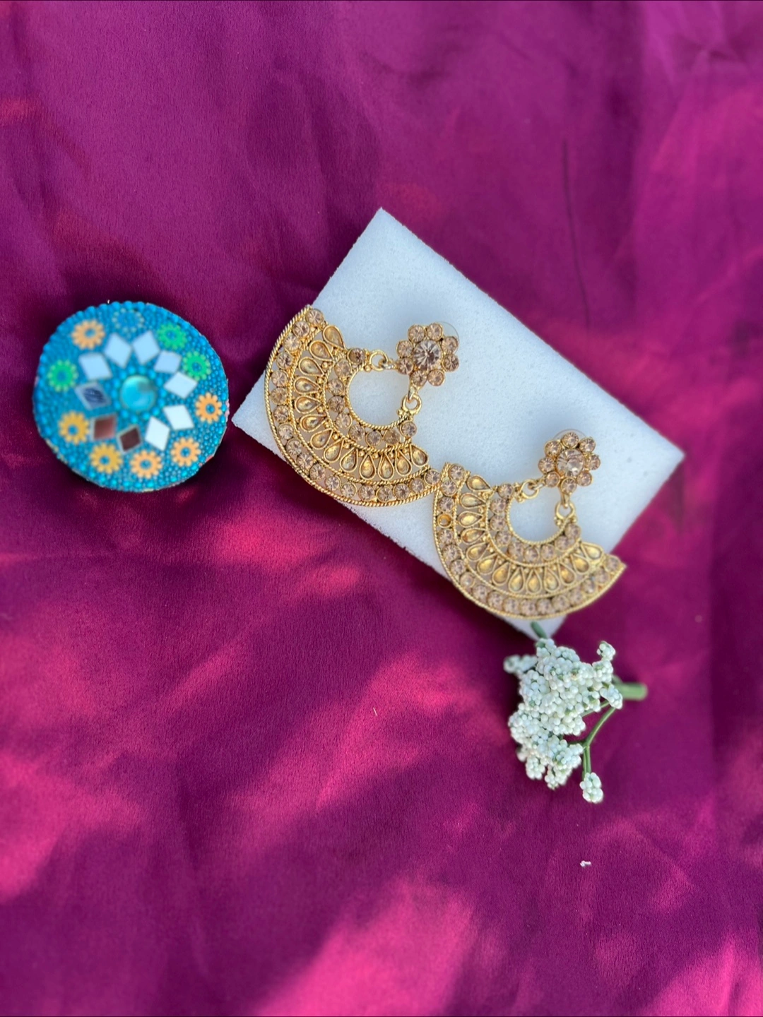 Selling a pair of gold-coloured fashion earrings. They have a beautiful, intricate design. Perfect for adding a touch of elegance to any outfit!