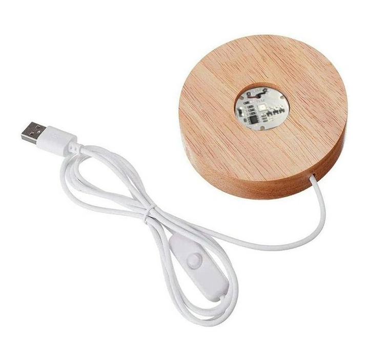 Selling a new wooden LED display base! It comes with its original box and a USB cable. Great for displaying crystals or other small decorative items. The base is made of wood and has a simple on/off switch on the cable.