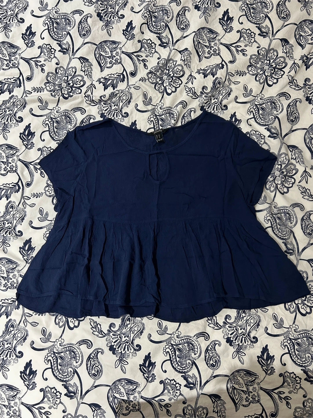 Navy blue blouse. Soft, lightweight, and comfortable material. Perfect for a casual day out. Washed/worn once only - in excellent condition (just wrinkled from sitting inside the closet). Size M (Medium).