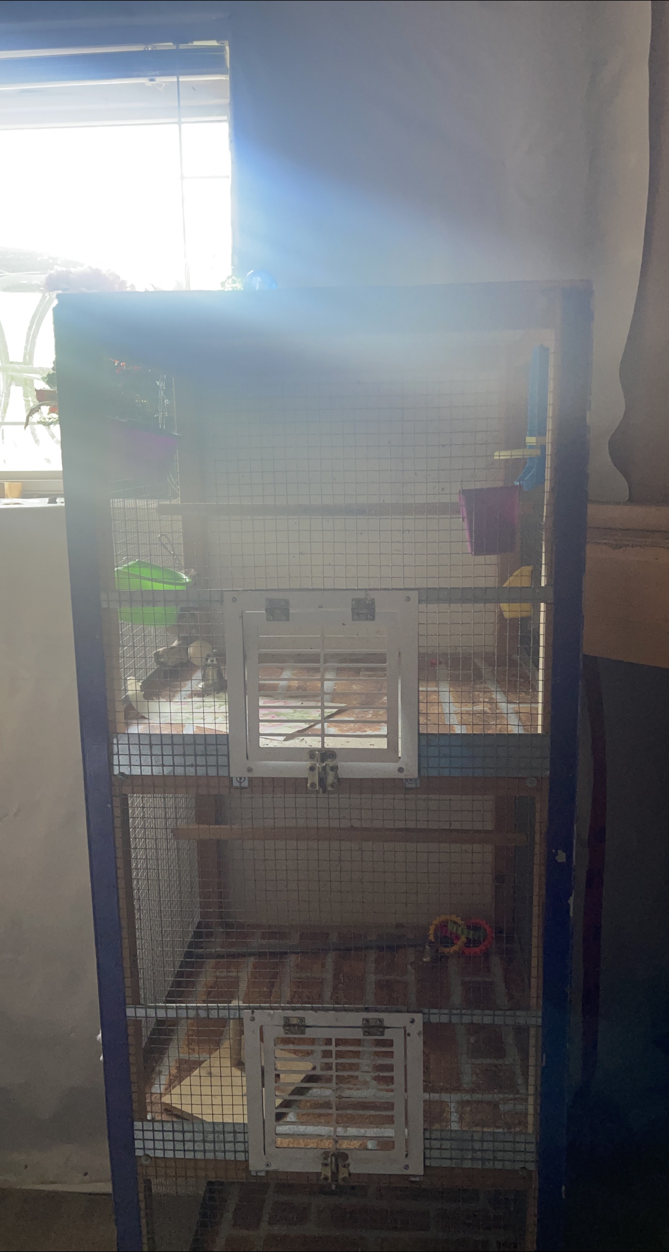 I'm selling a bird cage that comes with a few accessories. It has a blue frame and wire mesh. There are some perches and food/water dishes included. It appears to have two small doors at the bottom.