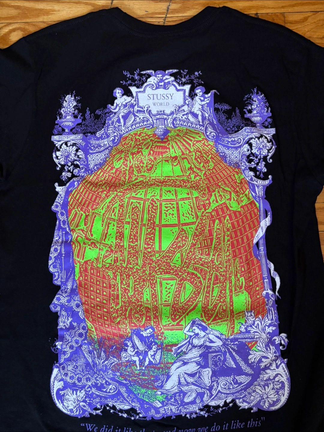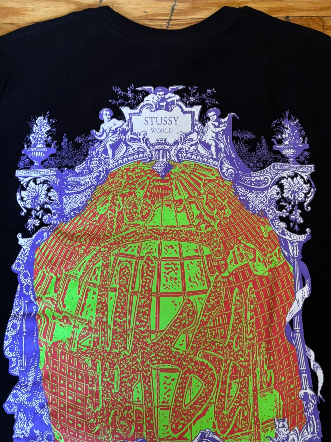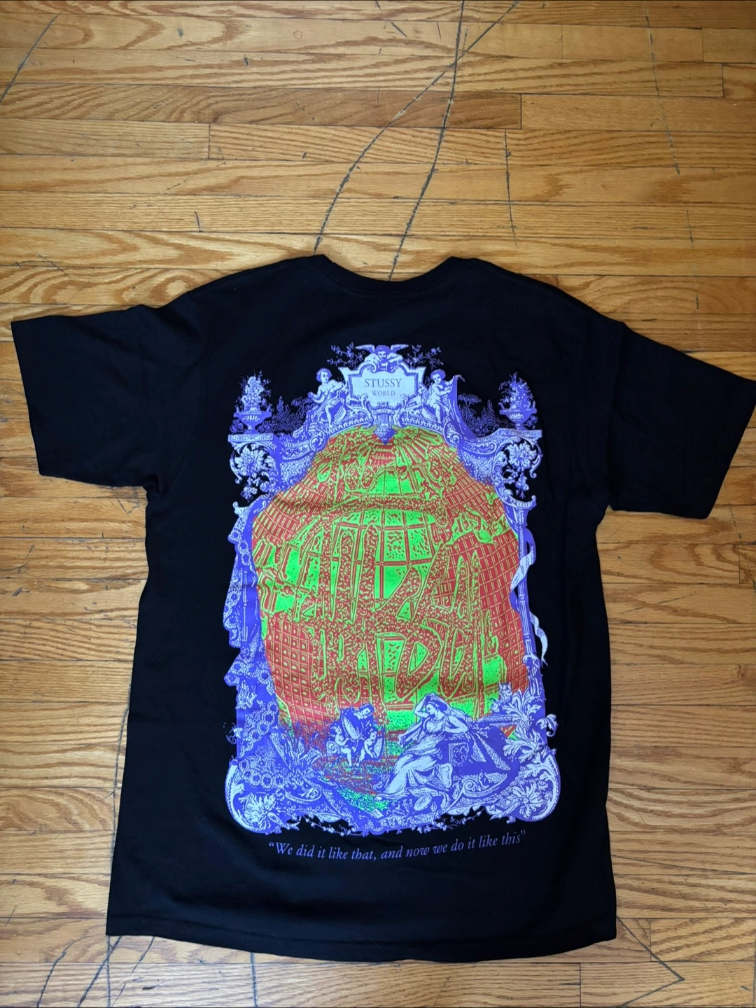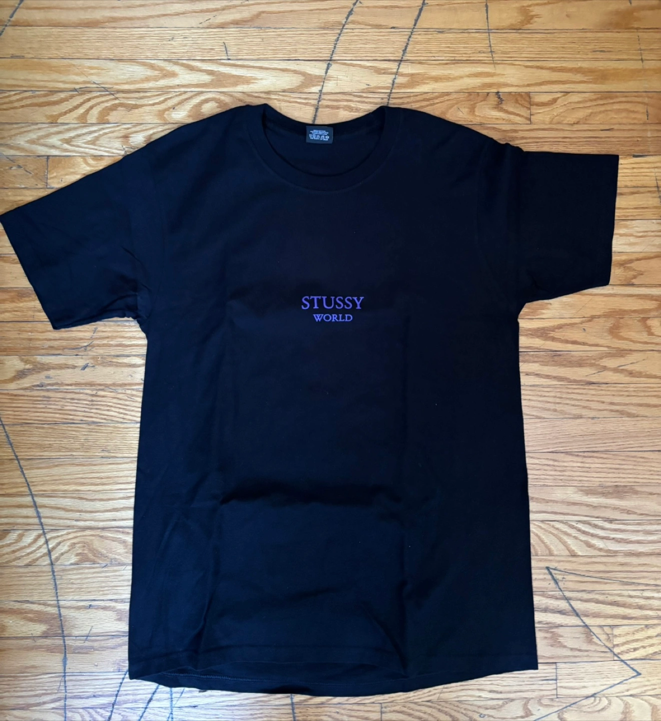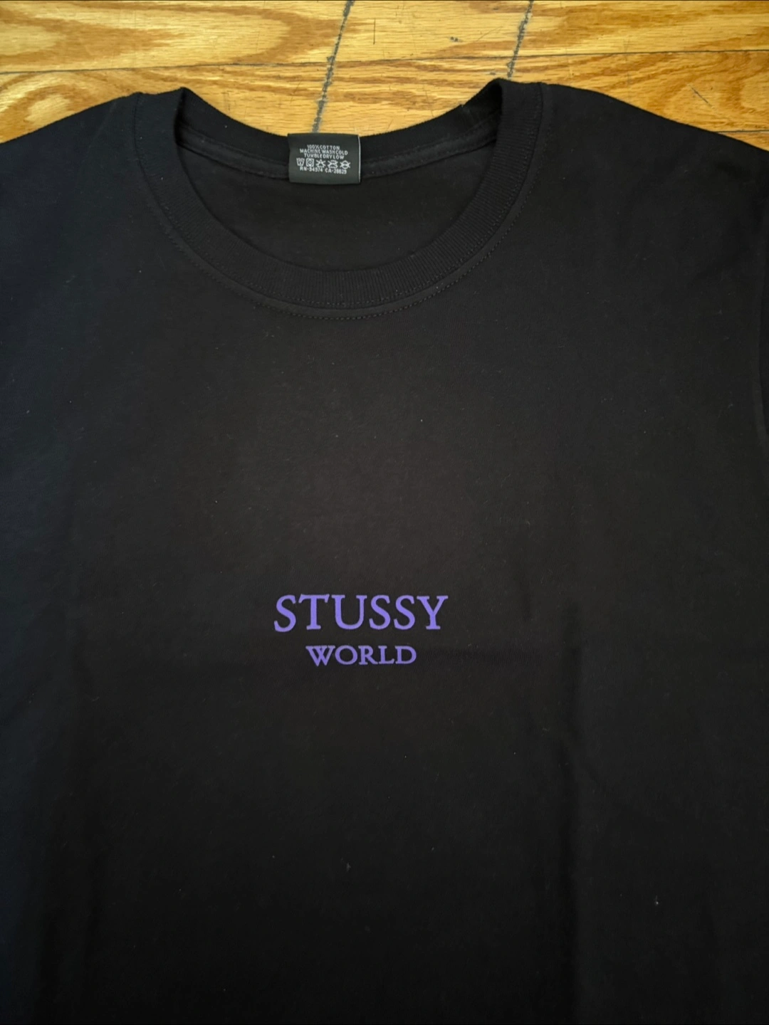 Selling a Stussy World Tour T-shirt in black. It's a size medium and features a cool design on the back. The shirt is in great condition and ready for a new home!